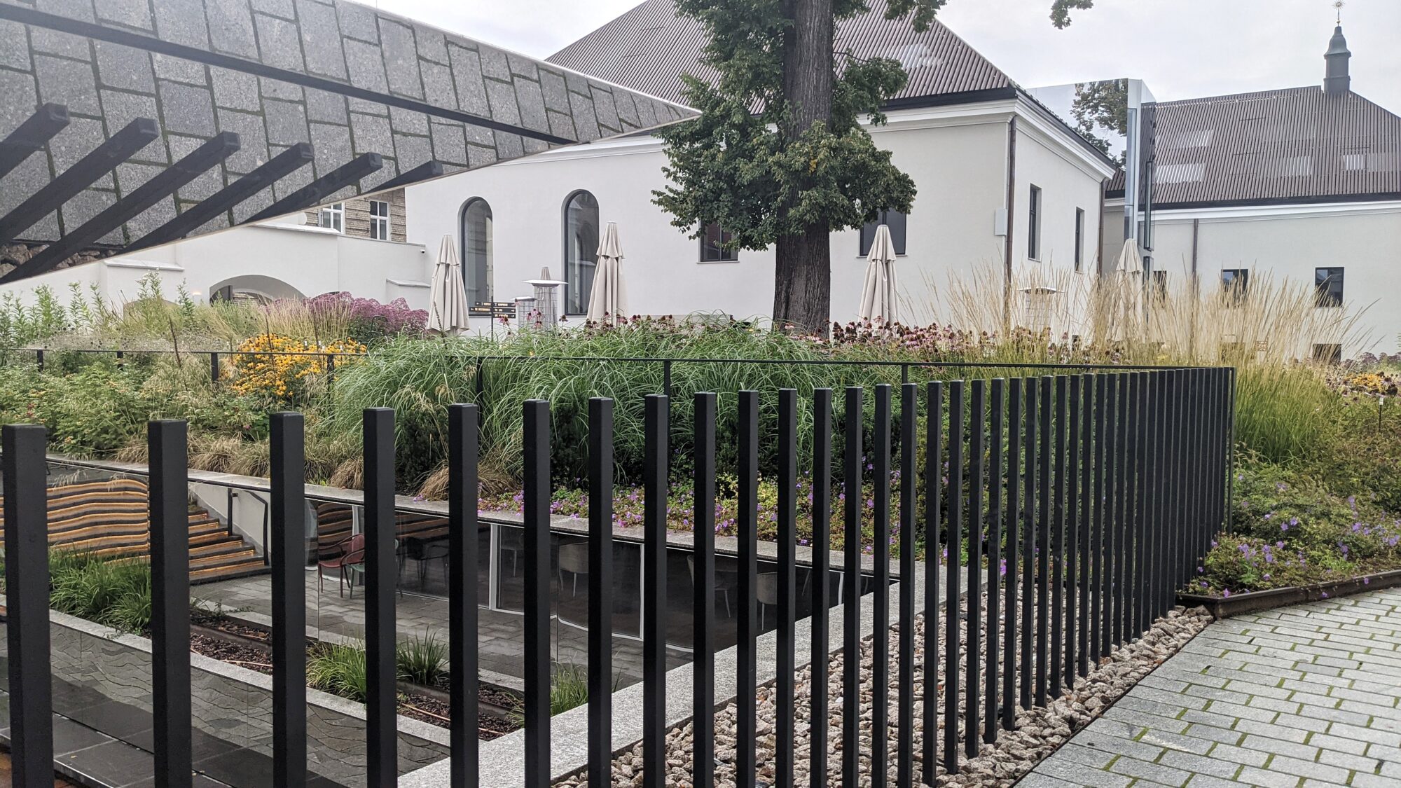Outdoor railings made of square bar. The fixings are hidden, only the individual metal bars are visible on the outside. The structure is powder-primed and finished in matt black RAL9005.