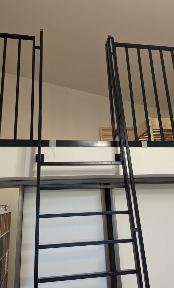 Metal staircase to attic. The staircase treads are made of solid ash and painted matt black.