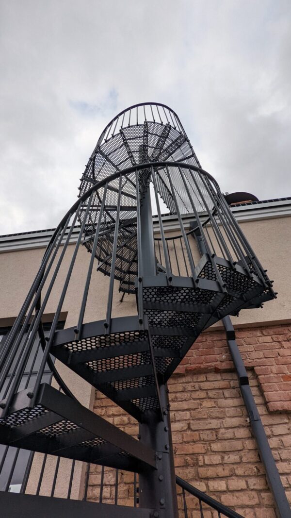 Metal spiral staircase. The structure is made of round black steel profiles which we painted in entrocite RAL7021. The steps are made by us from cross-drawn mesh and metal strips. We can offer a variety of stair solutions to suit each customer’s requirements.