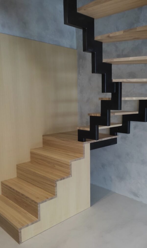 Metalinis laiptų karkasas, dar vadinamas. Tai yra vienas dažniausiai pasitaikantis laiptų modelis. Šiame projekte papildomai pirmą marša apdirbome medžiu iš visų pusių.