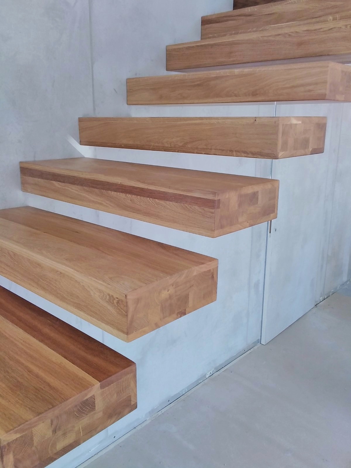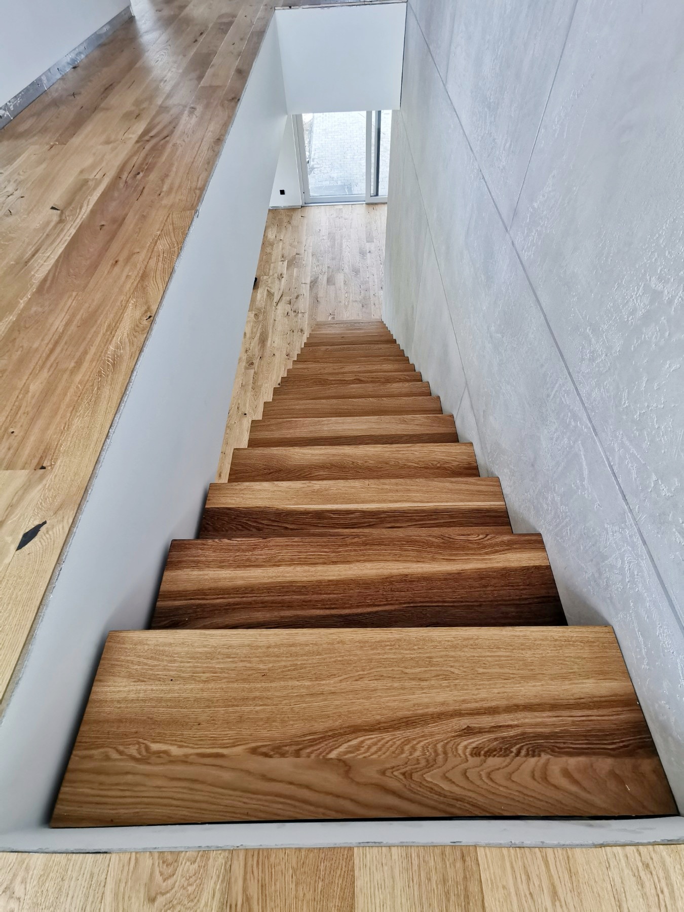 Solid oak staircase floating in the air. Solid oak is characterised by its grain. We usually recommend matching solid oak floors with the same type of wood. Our range includes solid oak class B – with knots.