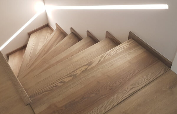 Solid ash treads with edge. At the customer’s request, we also produced the lower part of the staircase, known as the tread, which increased the price of the staircase by approximately 30%. We also produced the side edges. The front part of the tread protrudes by 30 mm. The colour is matched to the floor, everything is stained and varnished.