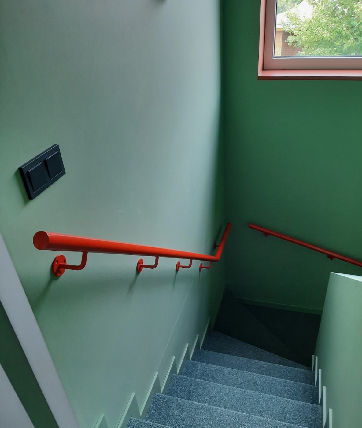 Round internal handrails. We can produce handrails in round profiles on request. The handrails are powder coated in RAL3016 red.
