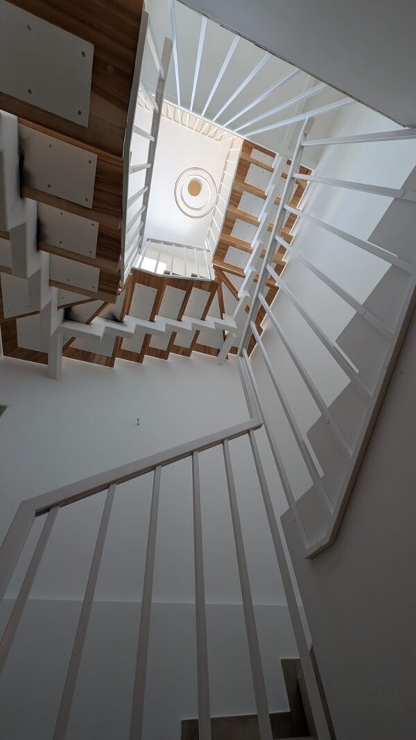 Metal railings with white painted wooden handrails across three floors. The white painted handrails give the structure a sense of unity and lightness. In addition, we renovated the old stair treads in this project, repainted them, and reinstalled them.