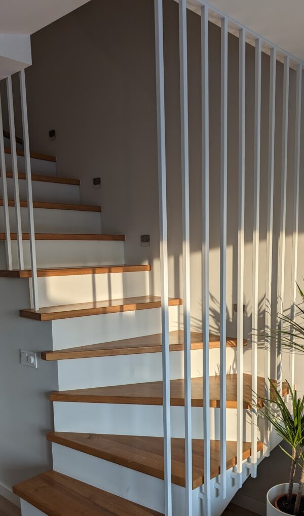Metal handrail over three floors. The handrail is made of square profiles and the fixing points are hidden with special fittings. The structure is powder-coated white, the handrail on the third floor is solid ash square.