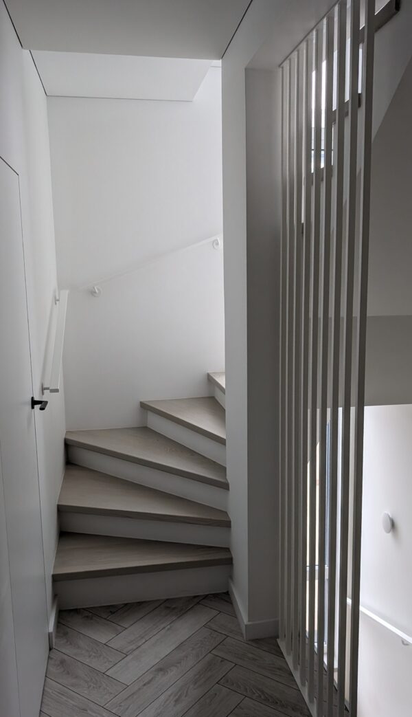 Three floors of interior metal railings and armrests. For this project we used rectangular metal profiles for the handrails, square metal profiles for the balustrade up to the ceiling and covered the side of the staircase with 10mm clear glass.
