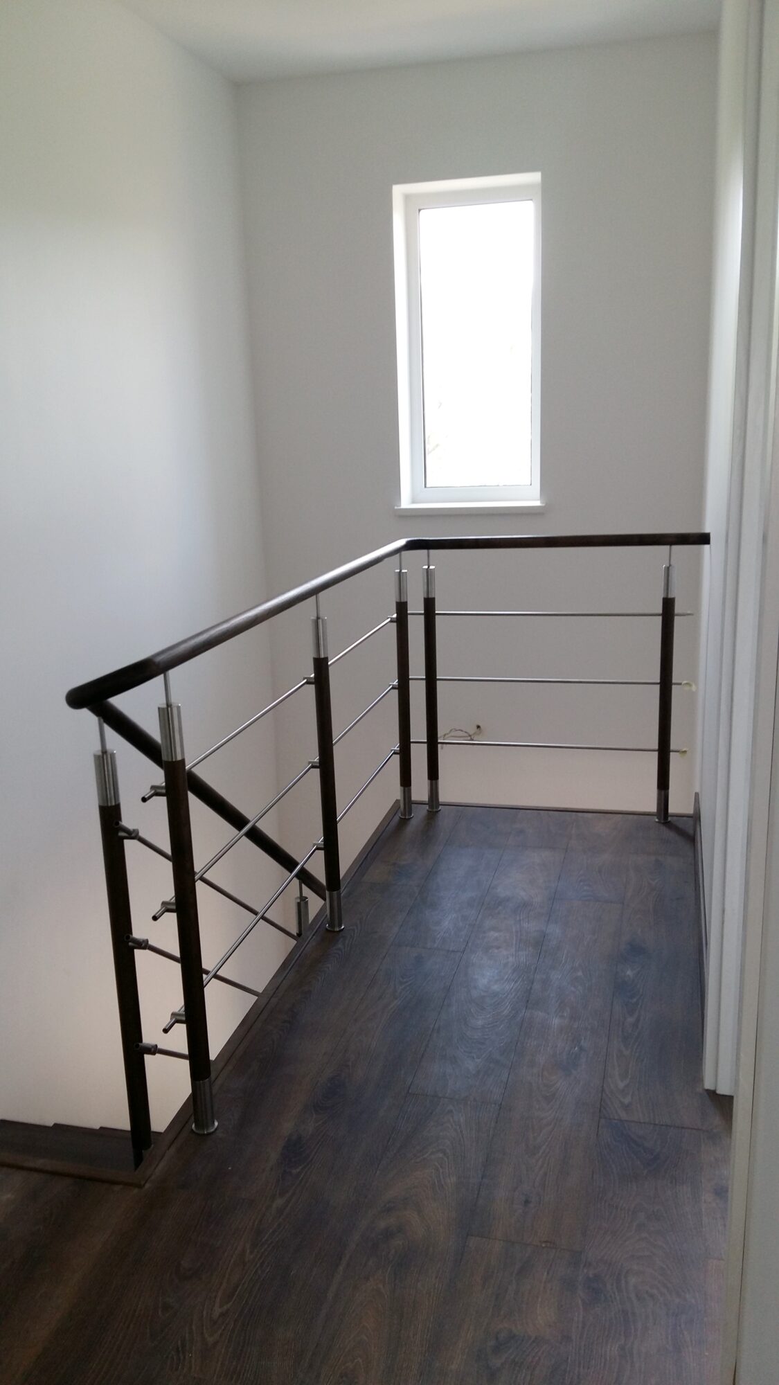 Round wooden banisters. The colour of the handrail and the wooden balusters of the staircase is matched to the floor. Stainless steel tubes inside the handrail.