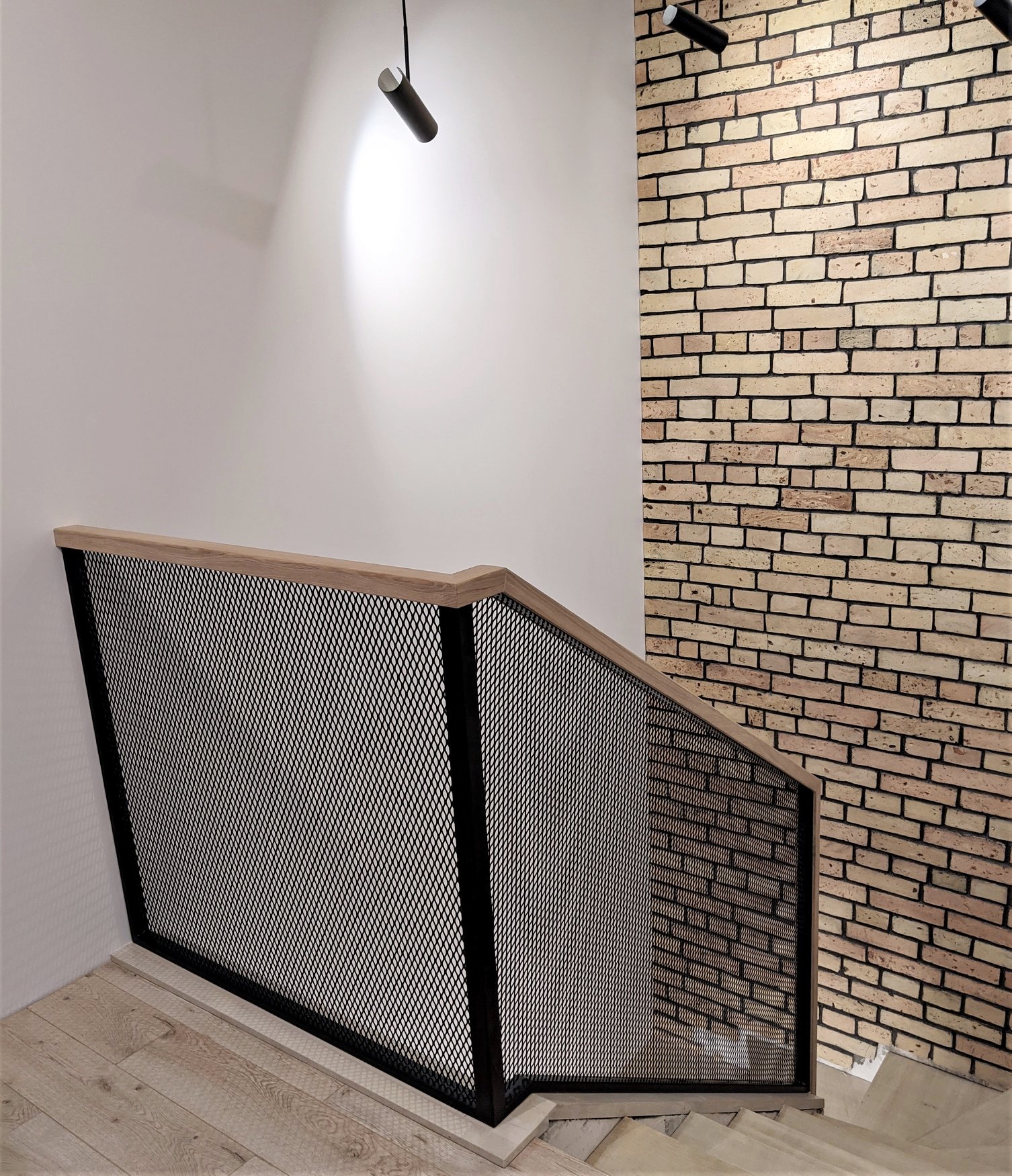 Metal railings with wooden armrest. This style of interior handrail is stylish and very safe. For those who want an industrial-style railing at home, we can offer design and manufacture of this style of railing.