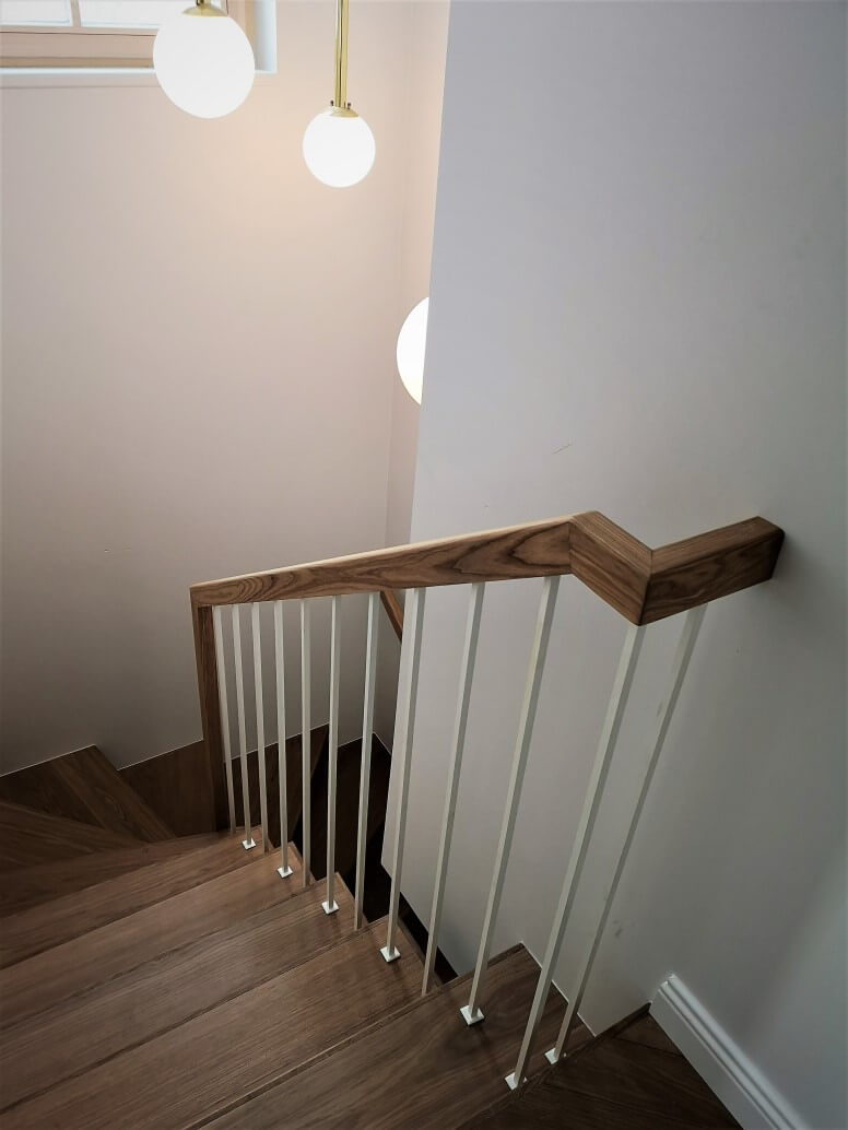 Classic handrails with decorative details. During the design process, we decided to offer the client square decorative details at the bottom of the balusters, and the result was excellent.