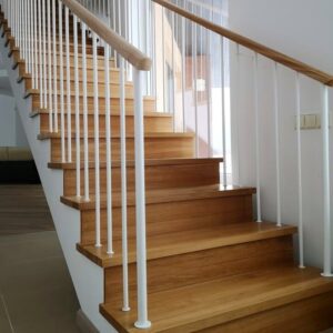 Handrail from first to second floor with a custom-made fixing system. The customer wanted the handrail to be attached to the side. There was no gap between the railing and the staircase, so we made a break in the middle of the structure to meet the customer’s requirements. Both the handrail and the wooden armrest were painted matt black.