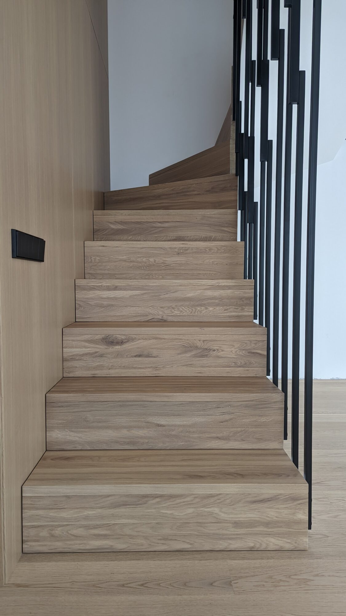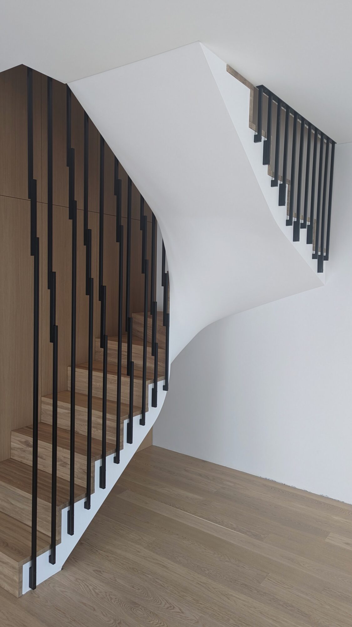 Handrail from first to second floor with a custom-made fixing system. The customer wanted the handrail to be attached to the side. There was no gap between the railing and the staircase, so we made a break in the middle of the structure to meet the customer’s requirements. Both the handrail and the wooden armrest were painted matt black.
