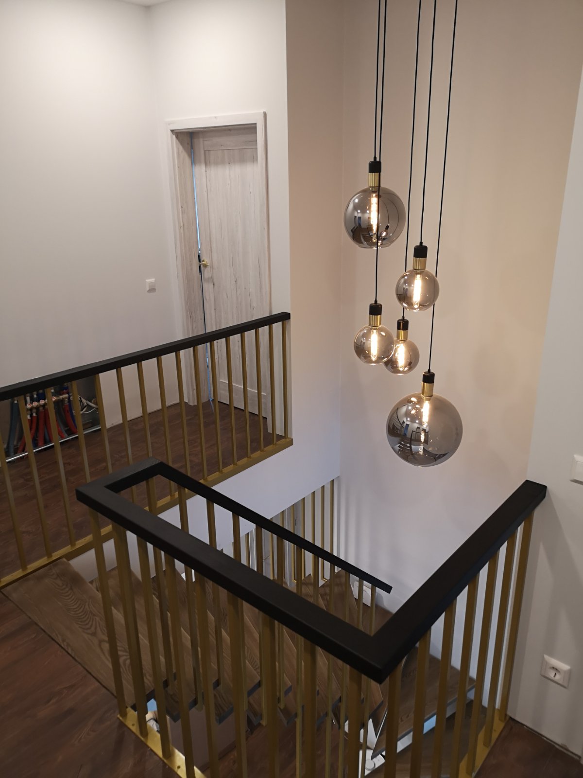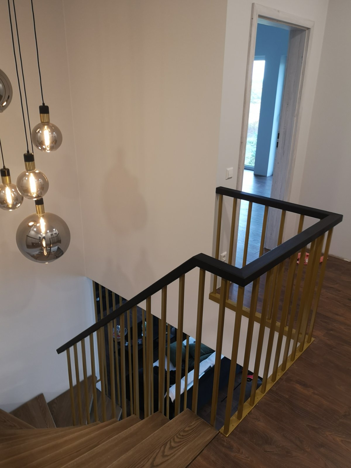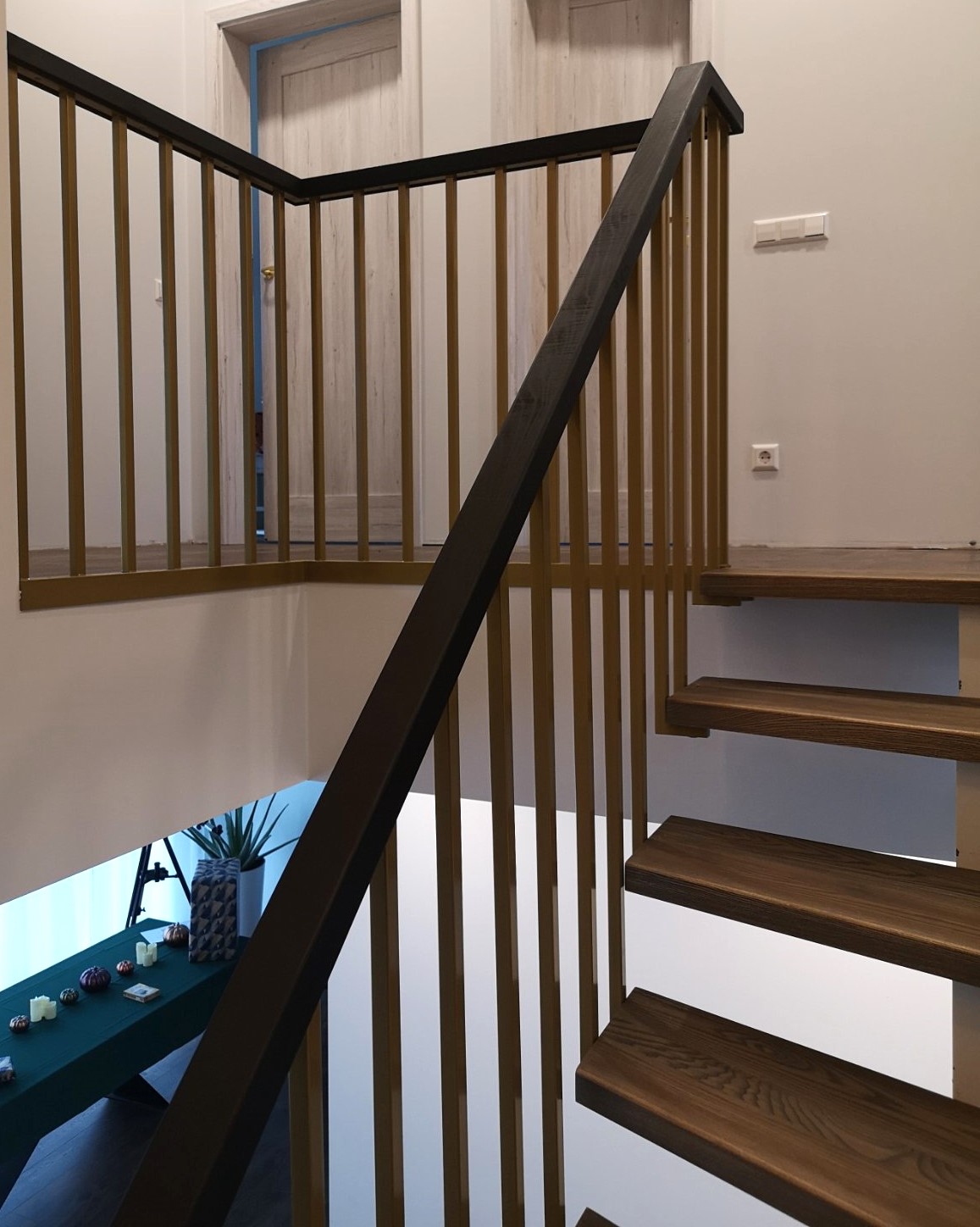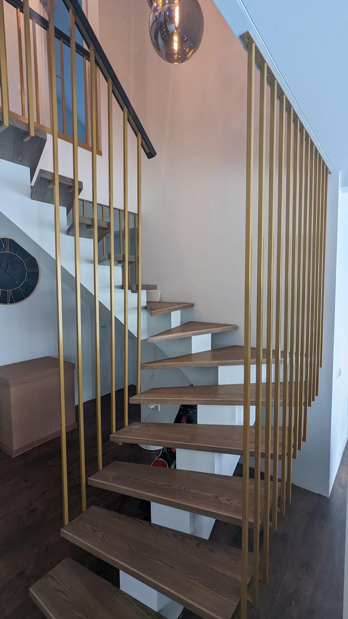 Gold painted interior railing. Handrails with non-standard fixing from the bottom of the step. All project details to be agreed with the client. Solid ash handrail finished in matt black.