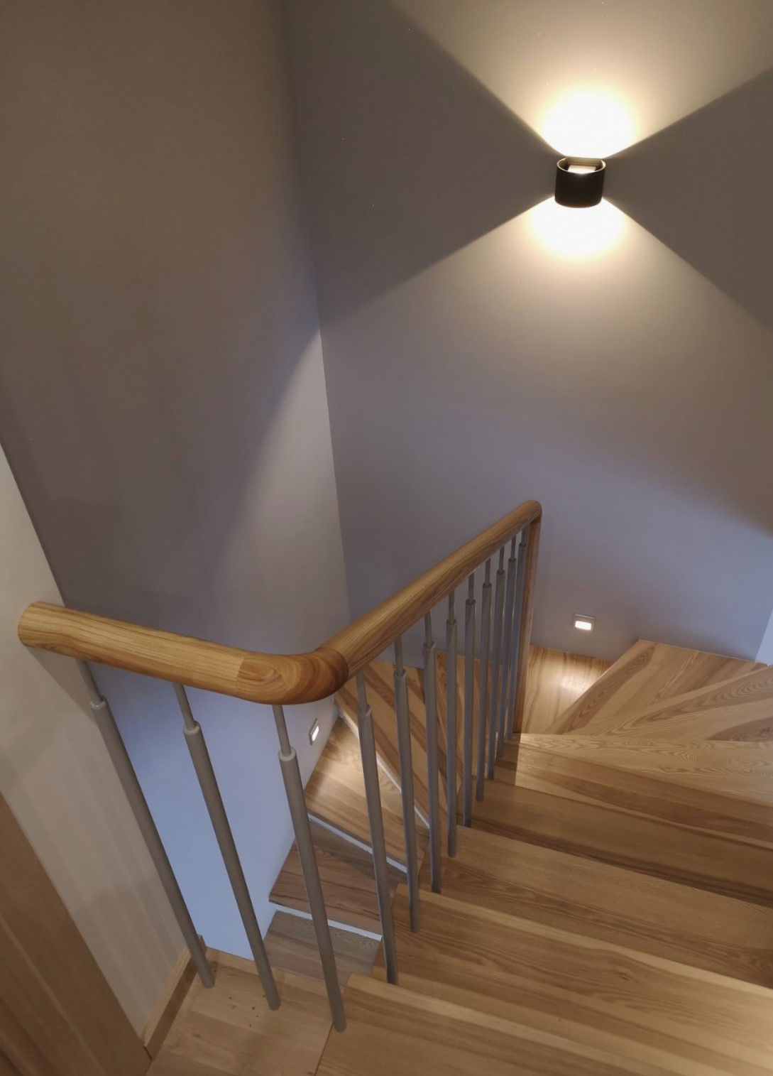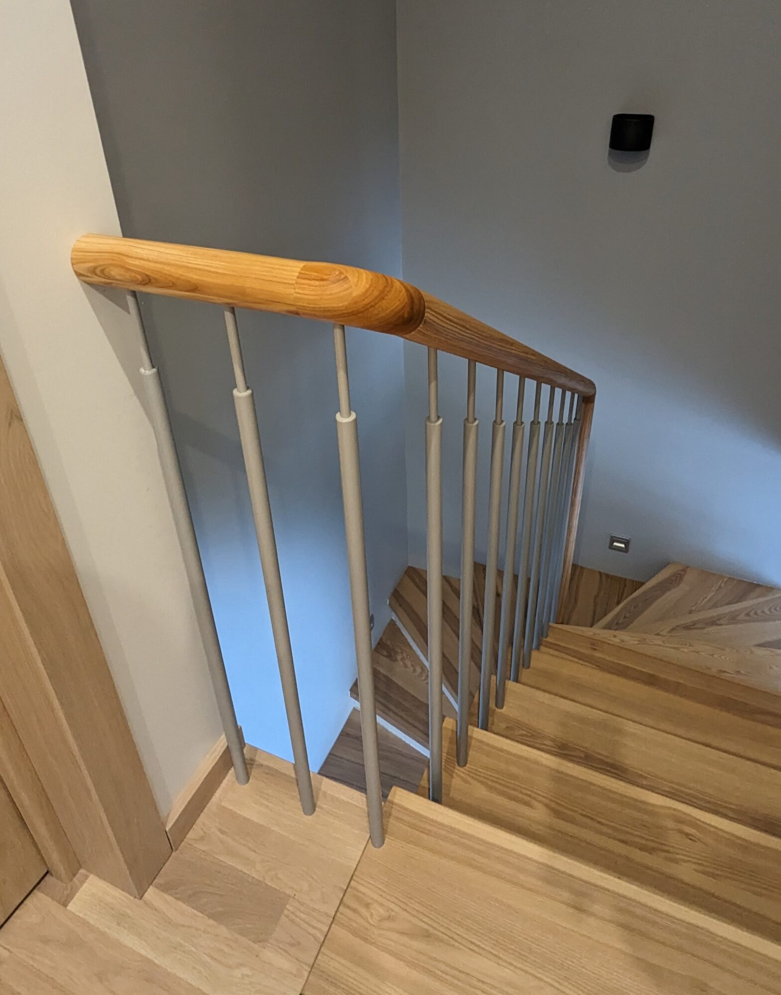Classic handrail with decorative metal element. We have flattened the end of the handrail tube to give it a light and distinctive feel. The armrest and tubes are round. The colour of the handrail is matched to the colour of the stair treads.