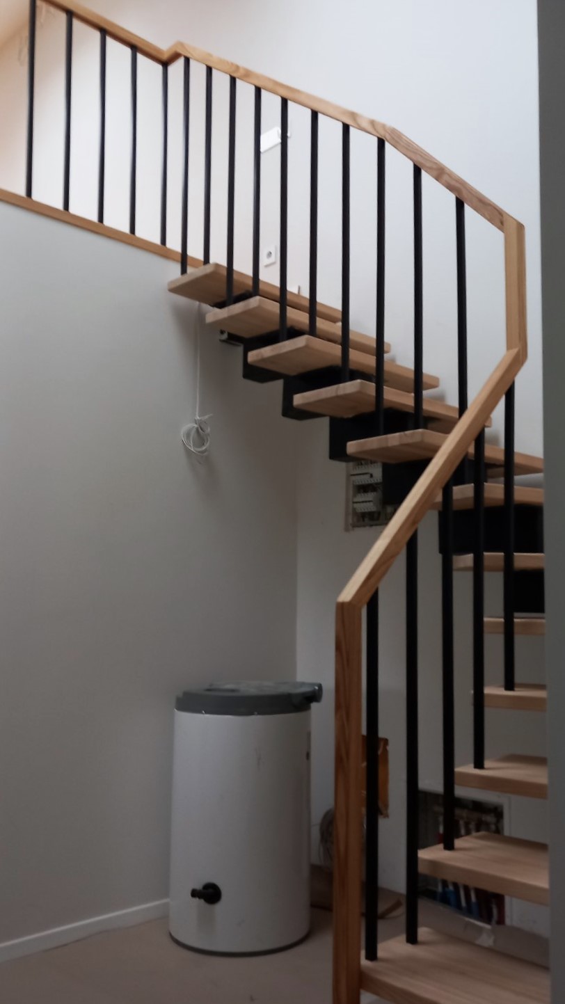 Classic handrails made from wood and metal. The height of the handrail depends on the height of the stair treads. The wooden handrail must pivot and descend at the pivot point of the steps. That is why there are so many angles in this project.