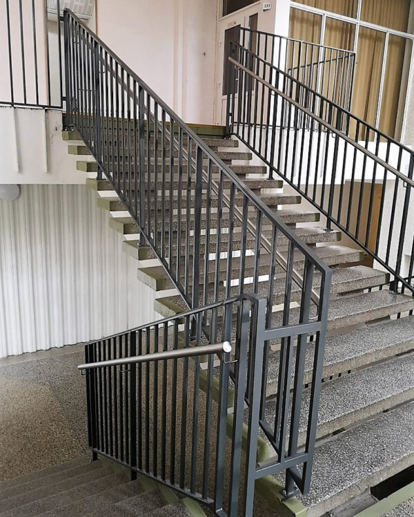School balustrades that meet all requirements. Handrail height H1200 mm, tube spacing not more than 100 mm. The handrail can be powder coated in all colours.