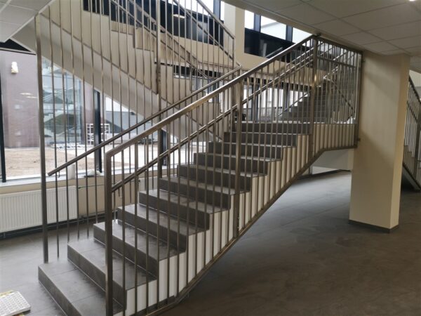 Stainless steel school balustrade. On one side we have made the handrail over two floors. The railings meet all requirements for educational establishments.