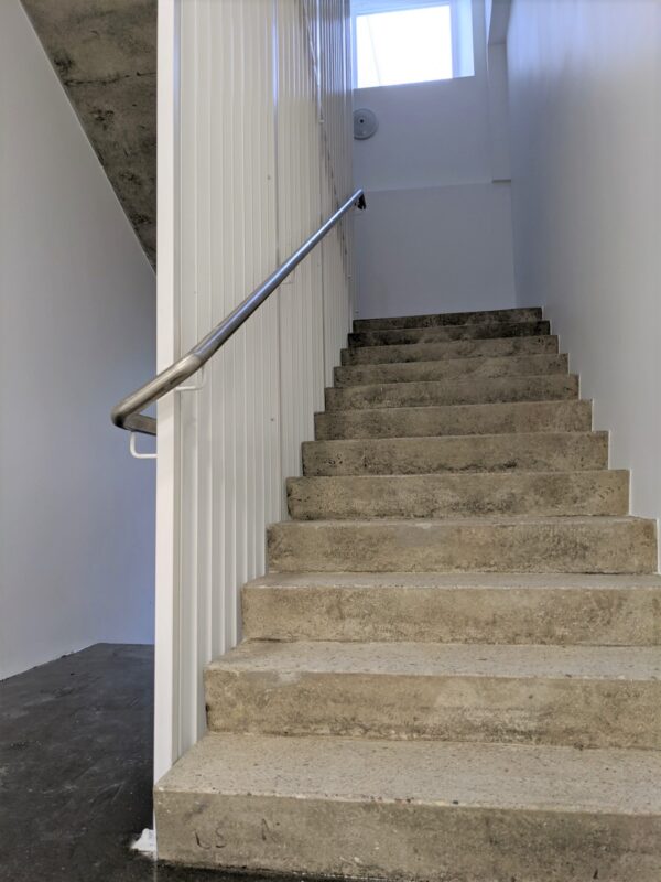 Exclusive educational institution railings in square profiles. The school railings are mounted to the side of the staircase marches to save staircase space and facilitate cleaning.