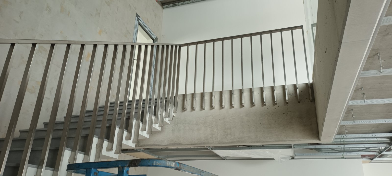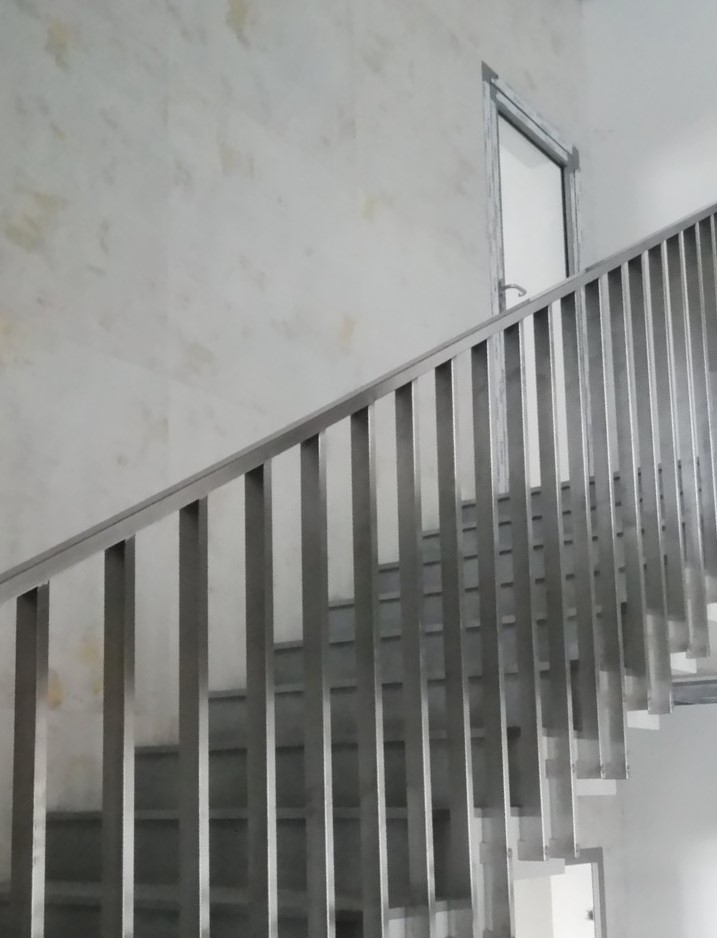 Office balustrade made of stainless steel. Stair handrail made of rectangular profiles. Side fixing for easy cleaning of stairs.