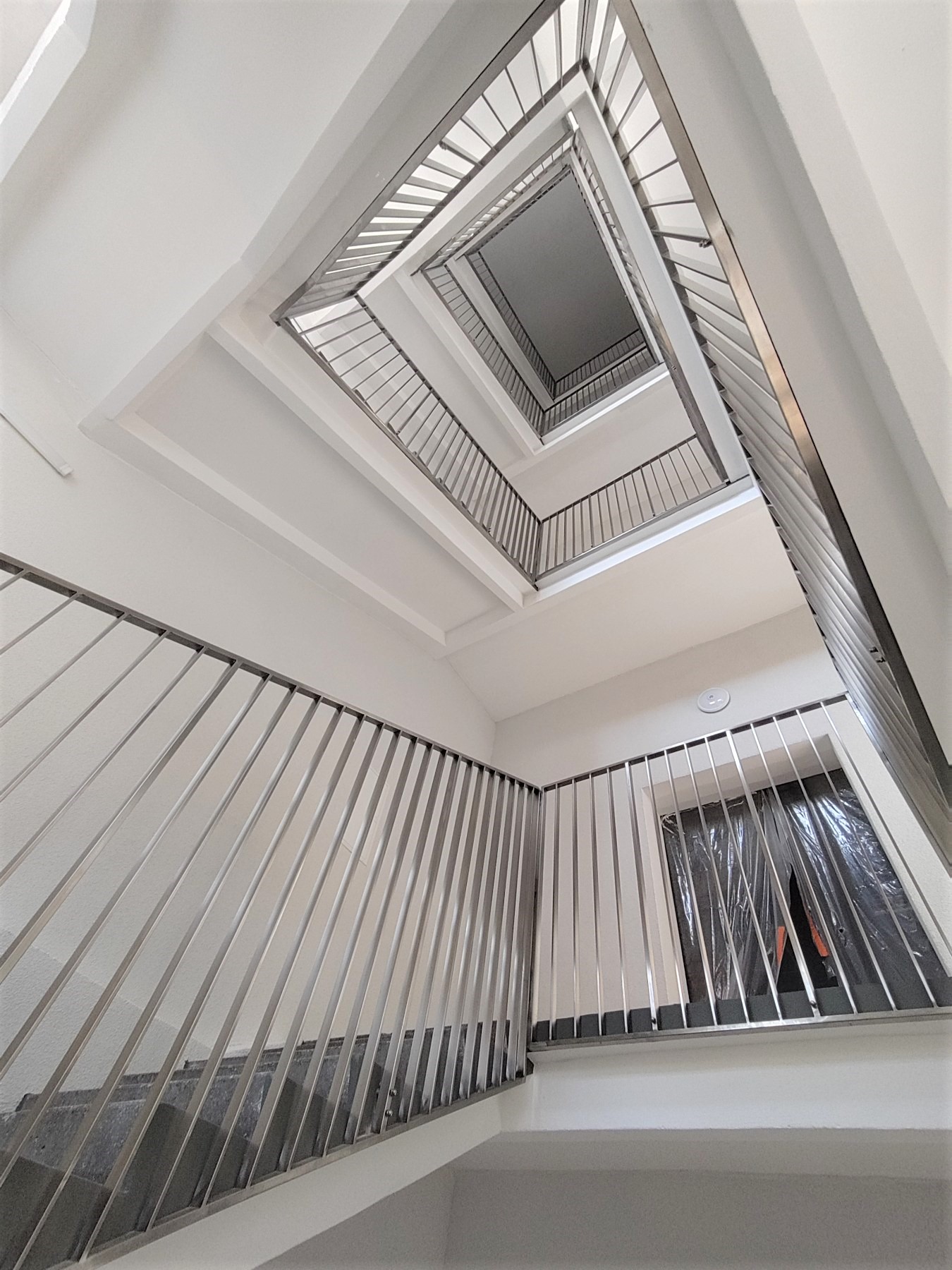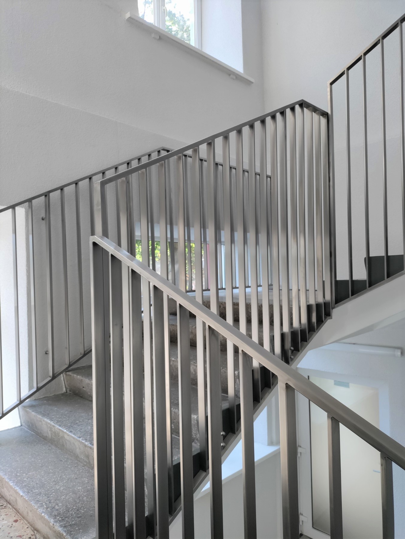 School handrails in stainless steel. The entire structure is made of rectangular stainless steel profiles. The handrails were mounted to the side of the stairs to preserve the stair area and to make cleaning easier.