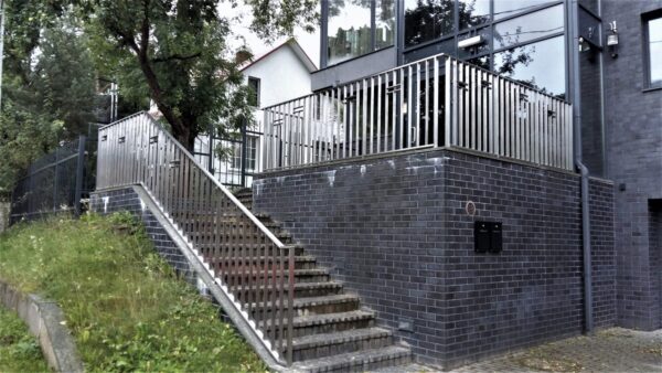 Stainless steel outdoor railing. The distinctive feature of the railing is the horizontal details, which we have coordinated with the customer by means of drawings. All projects of this type of railing are coordinated with the customer before production.