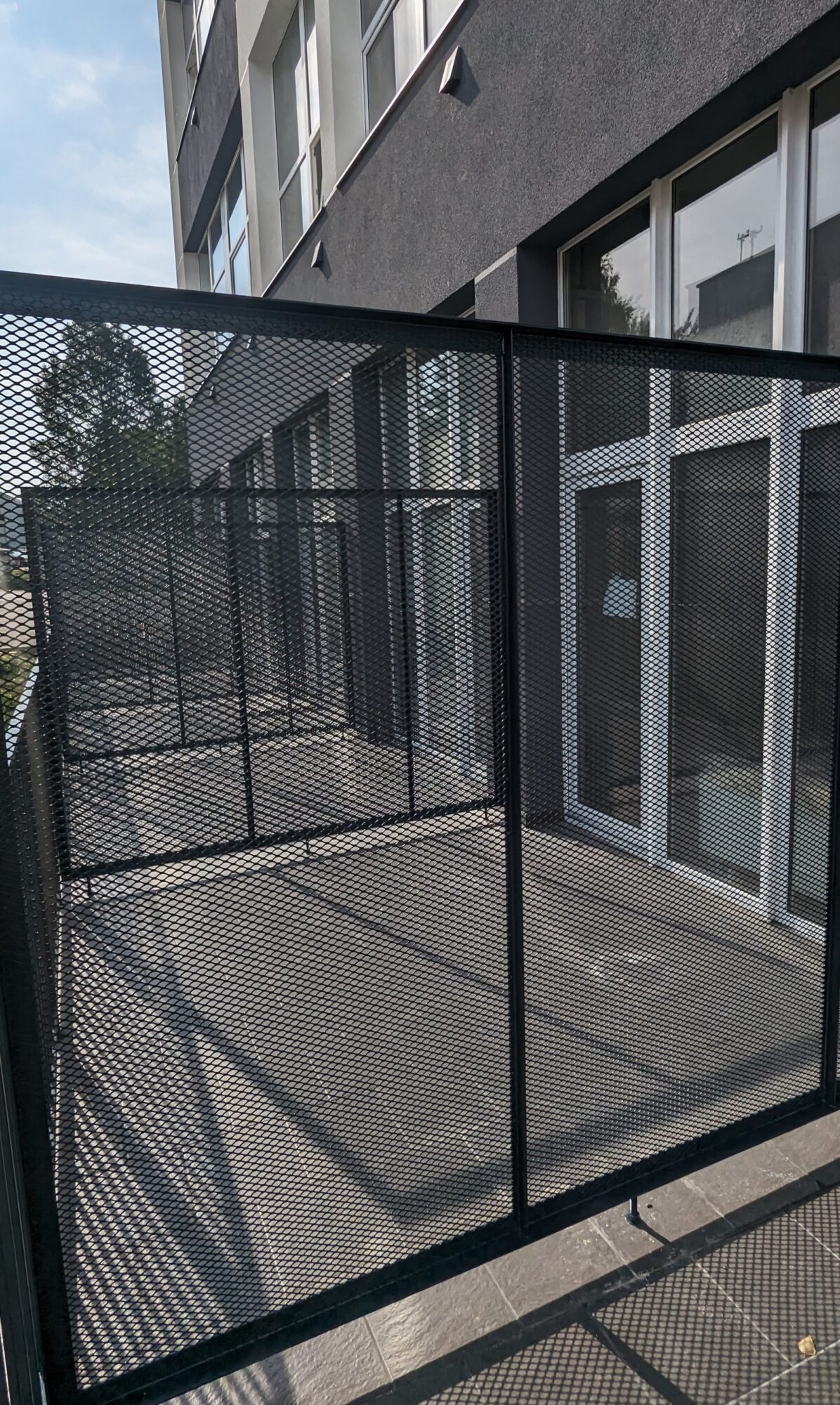 Cross-drawn mesh partitions. Metal structure in powder coated angle iron. We have welded the cross-drawn mesh to the inside of the structure.