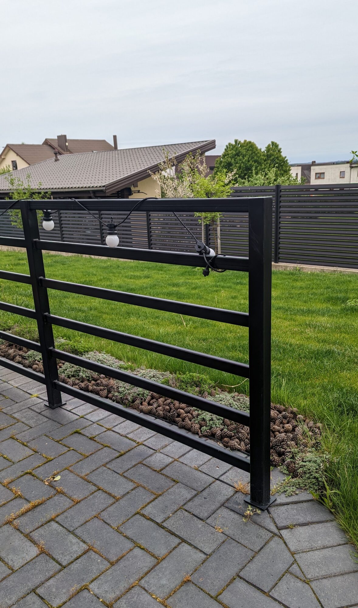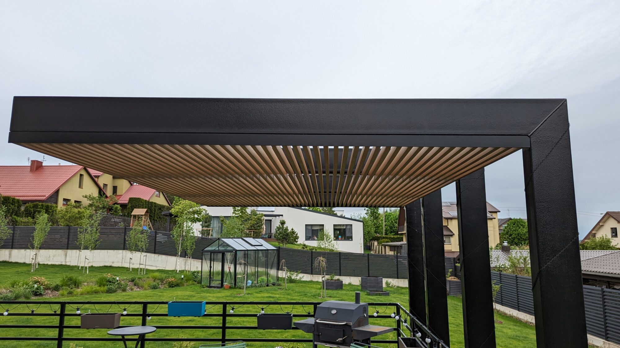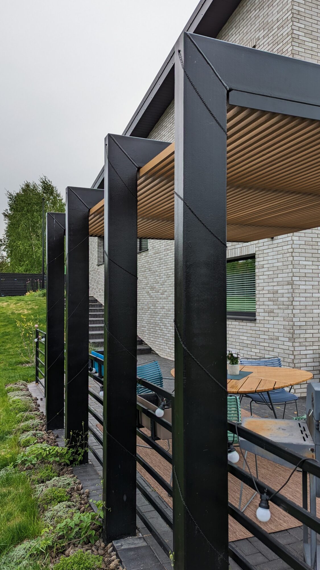 Outdoor terrace canopy in metal and WPC composite. For this project we carried out the fabrication and concreting of the metal structures. We screwed WPC composite panels to the structure. We installed square external railings around the perimeter of the terrace. All structures were powder coated in matt black RAL9005.