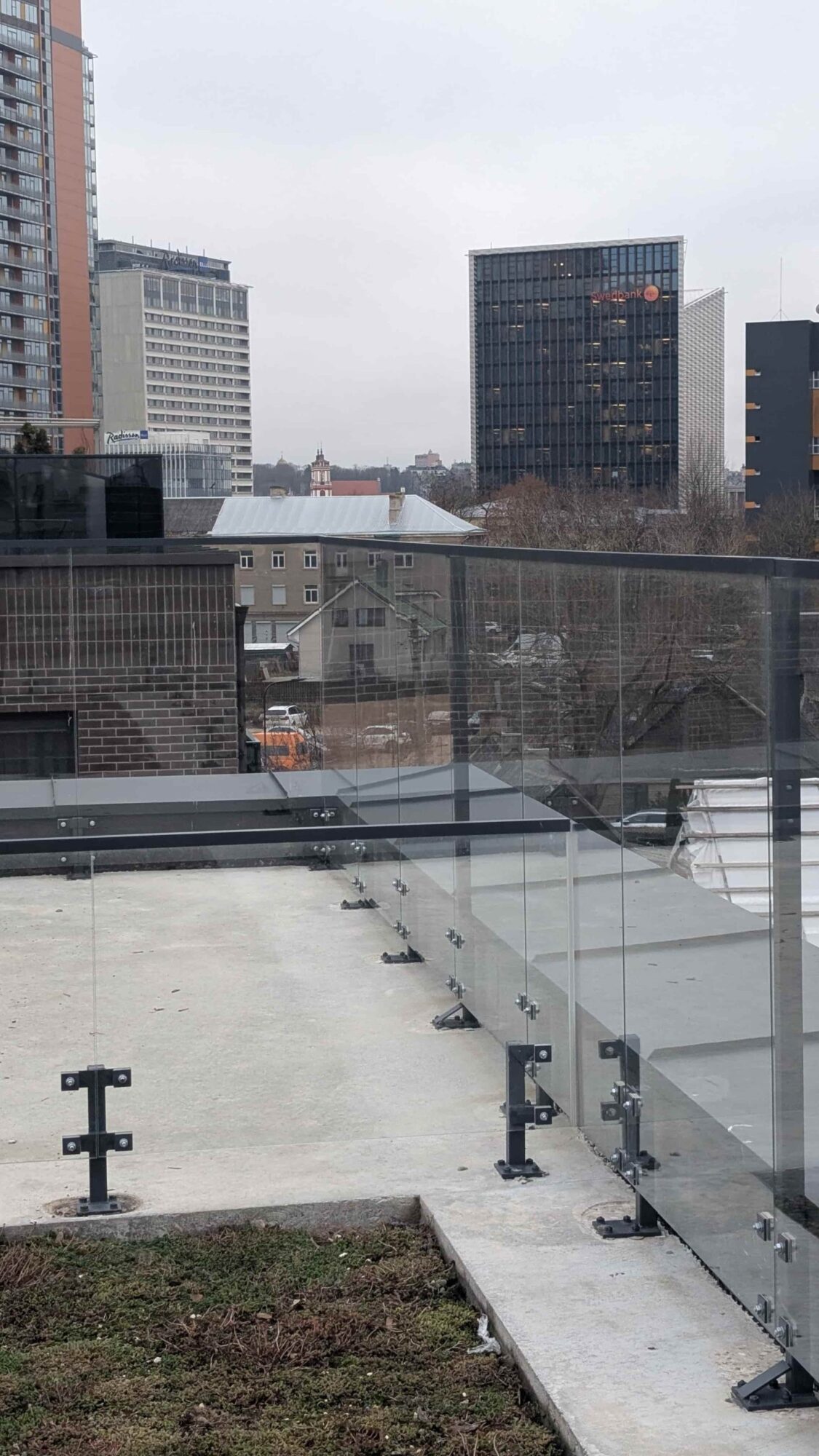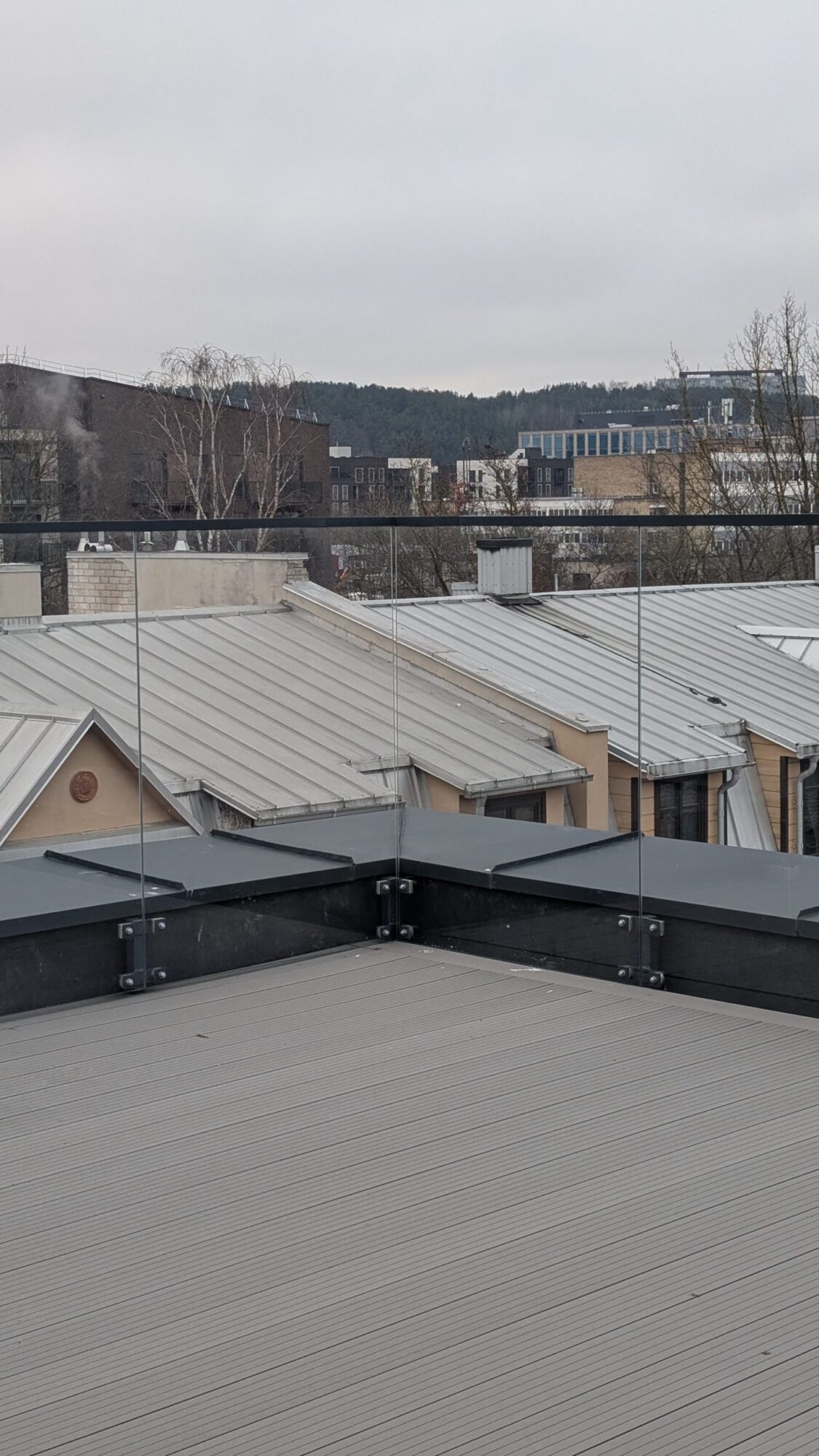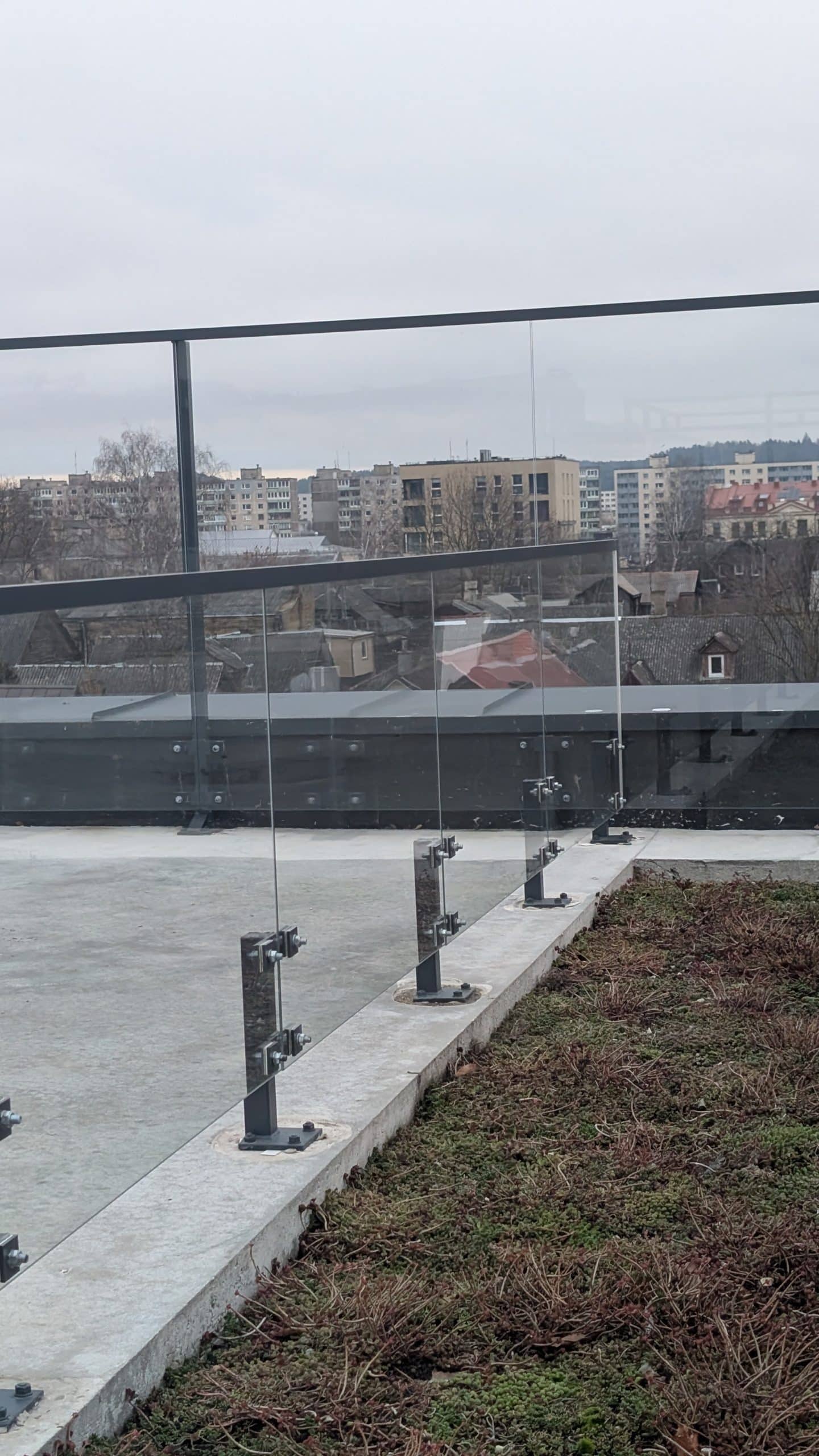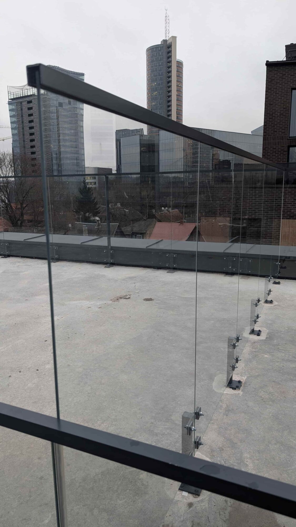 An apartment building with glass balustrades on the roof. For this project we used 8mm toughened glass and installed a powder coated armrest on top of the glass.