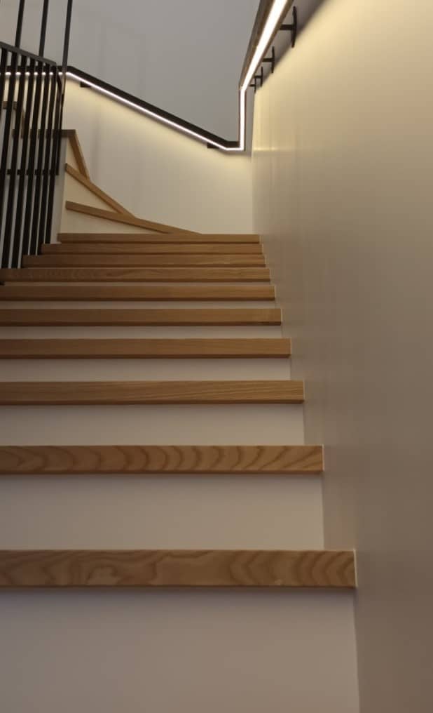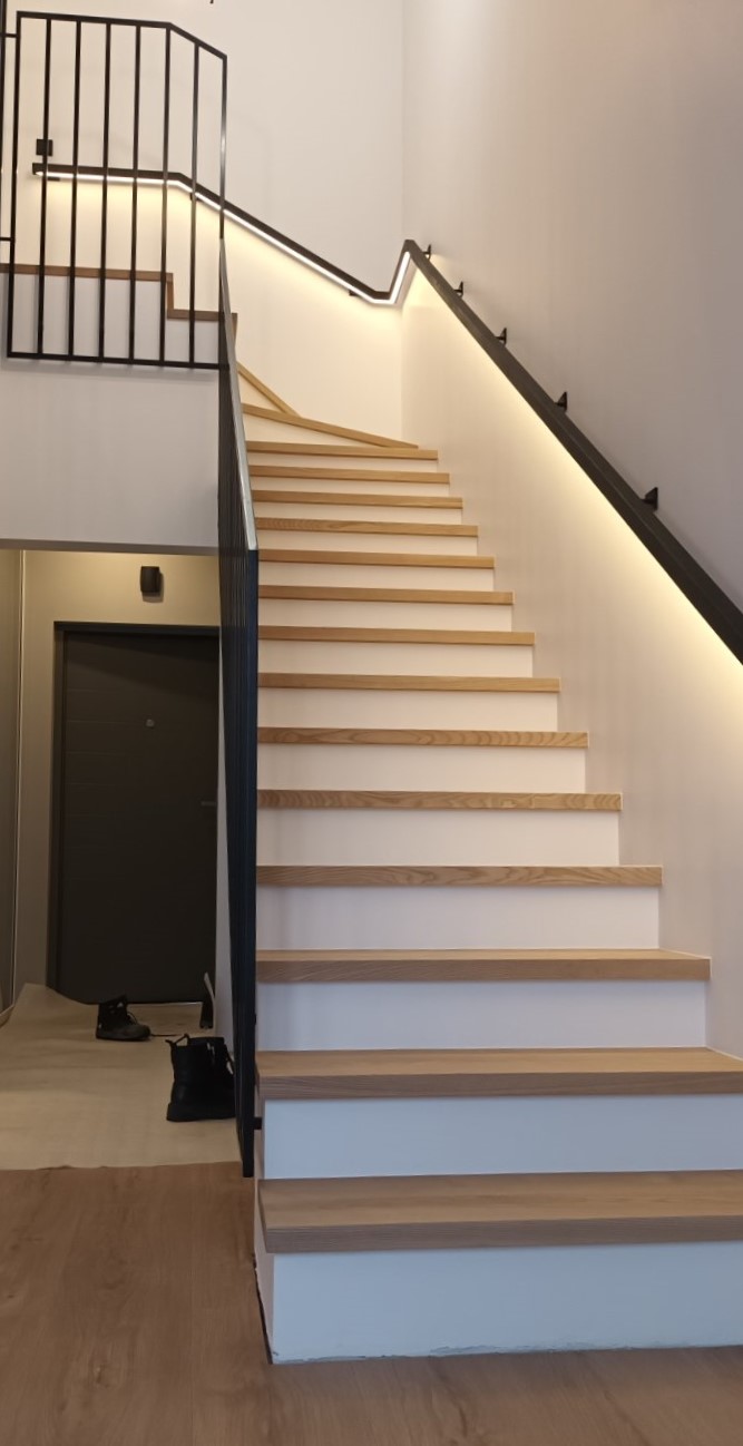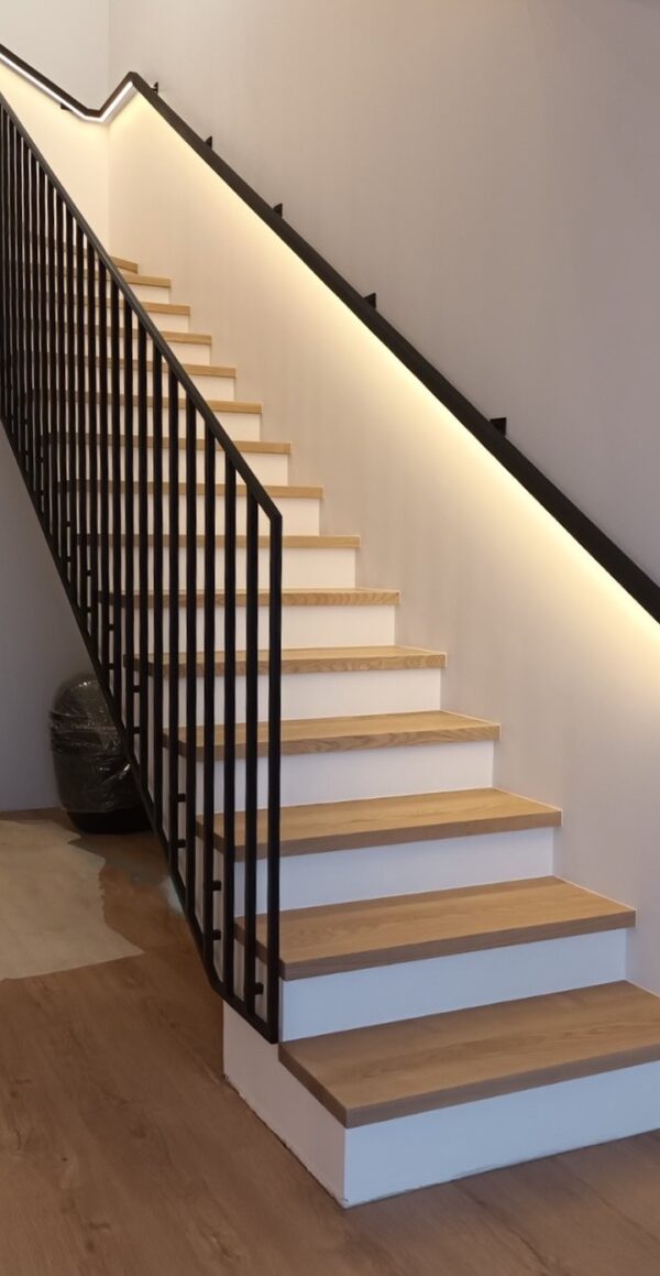 Indoor metal profile railing with additional armrest on the wall and integrated LED lighting. This project uses a single 20x20mm square profile used for the entire handrail, giving a seamless and minimalist design. At the client’s request, an additional armrest was added to the wall with LED lighting. It is made of solid wood and finished in matt black, creating an elegant and modern interior accent.