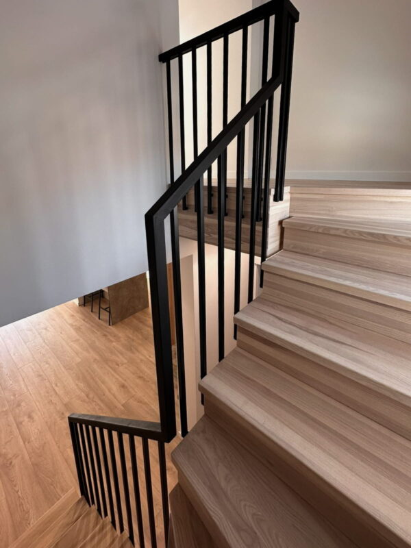 Black matt balustrades in square profiles. In order to preserve as much of the staircase as possible, we attached the handrails to the side of the steps. In addition, we installed a metal support underneath the stairs to ensure the stability and strength of the structure. All elements are finished in matt black RAL9005, giving a modern and aesthetic look.