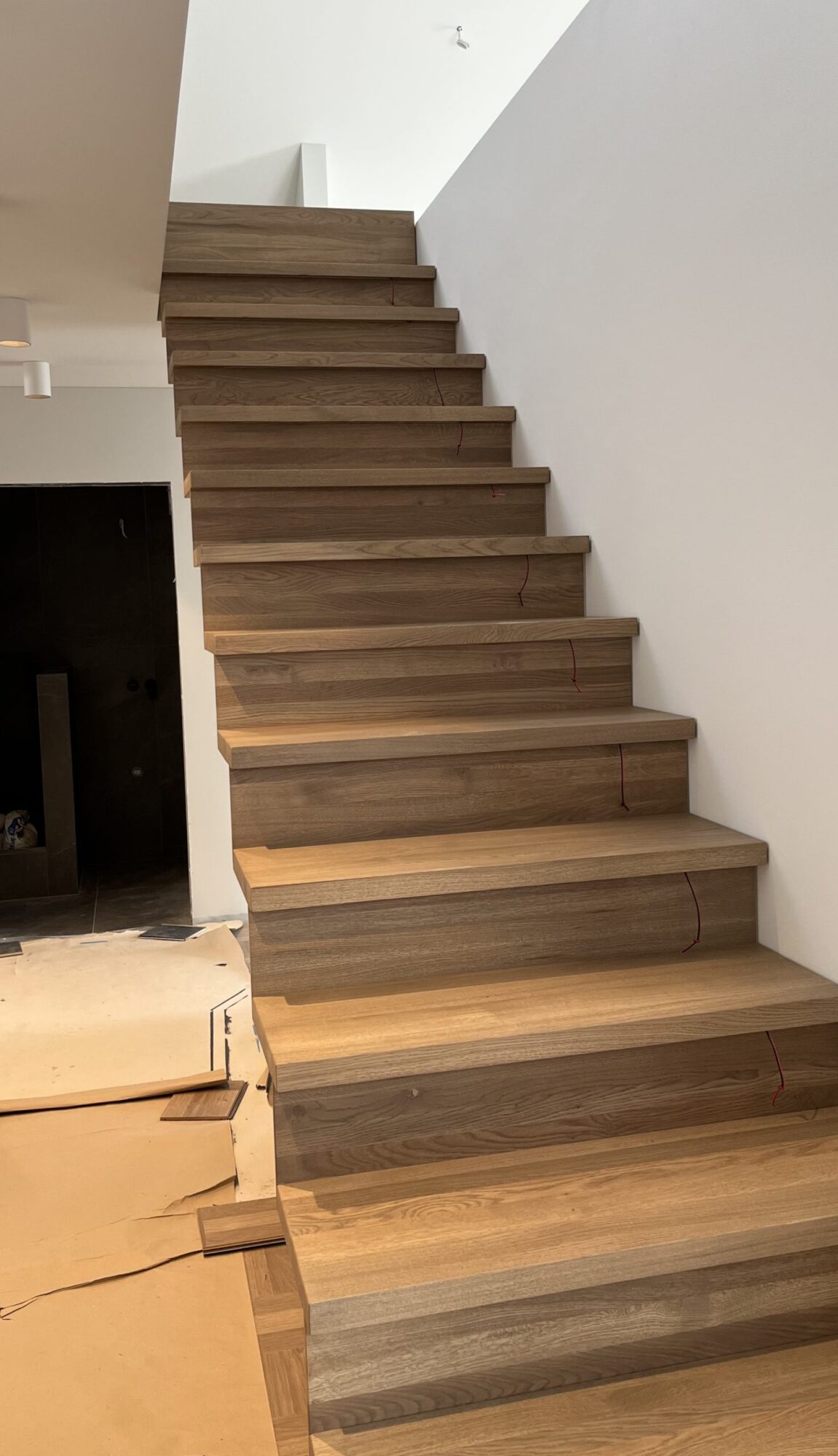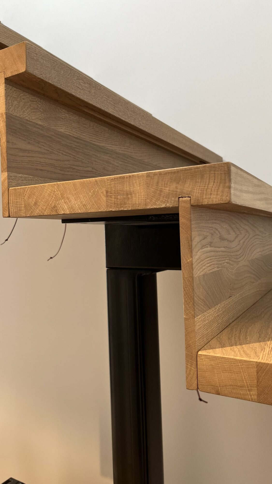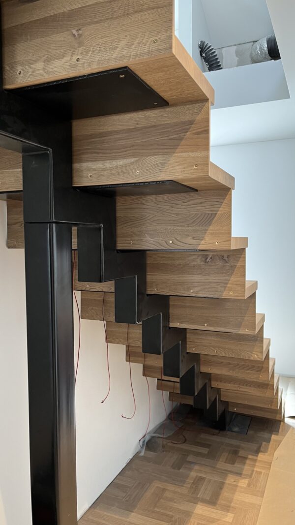 Black painted metal staircase with pad. In the middle of the staircase, we have made an additional fixing to the floor to give the structure stability. On the metal staircase, we installed solid oak steps.