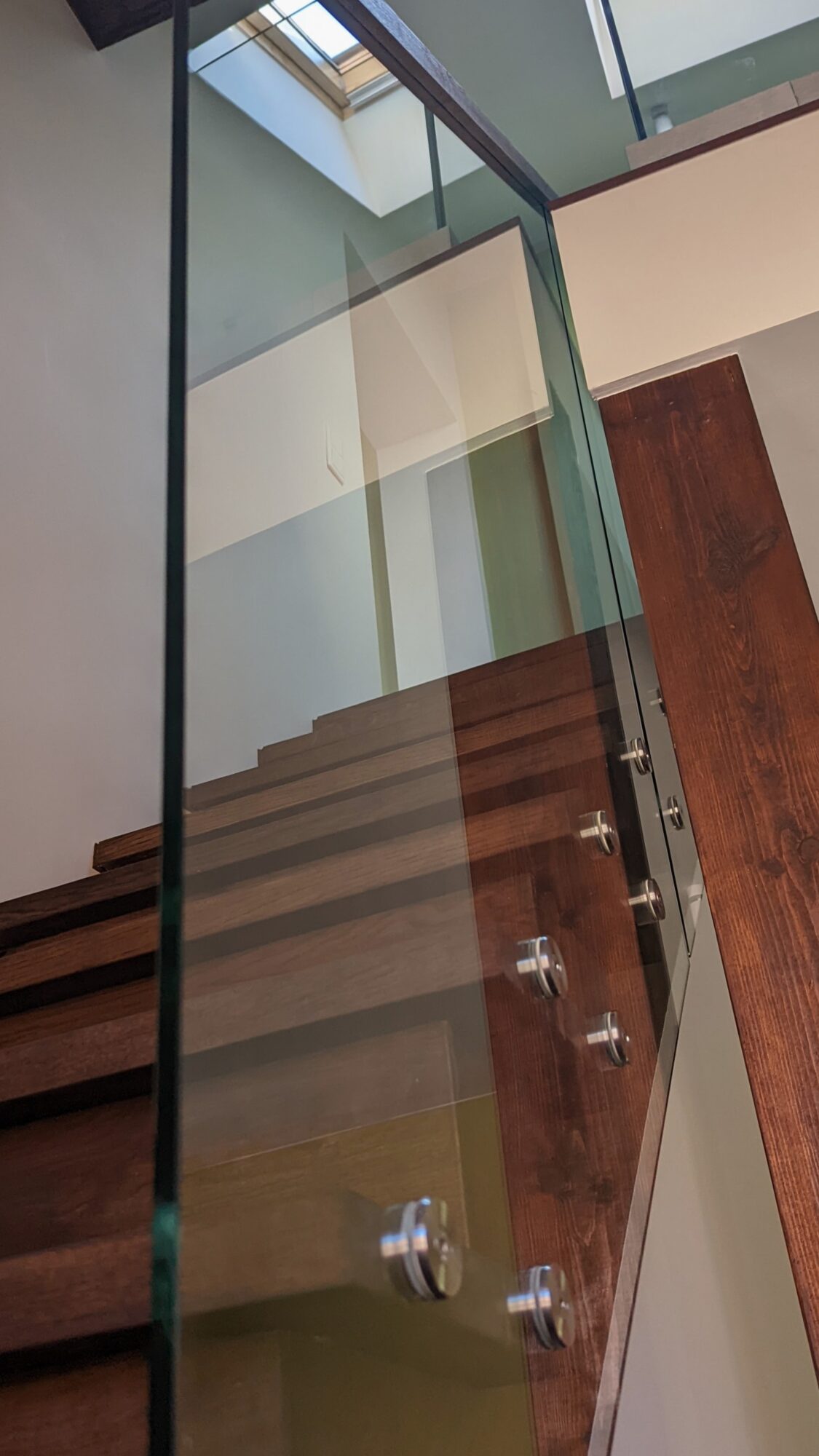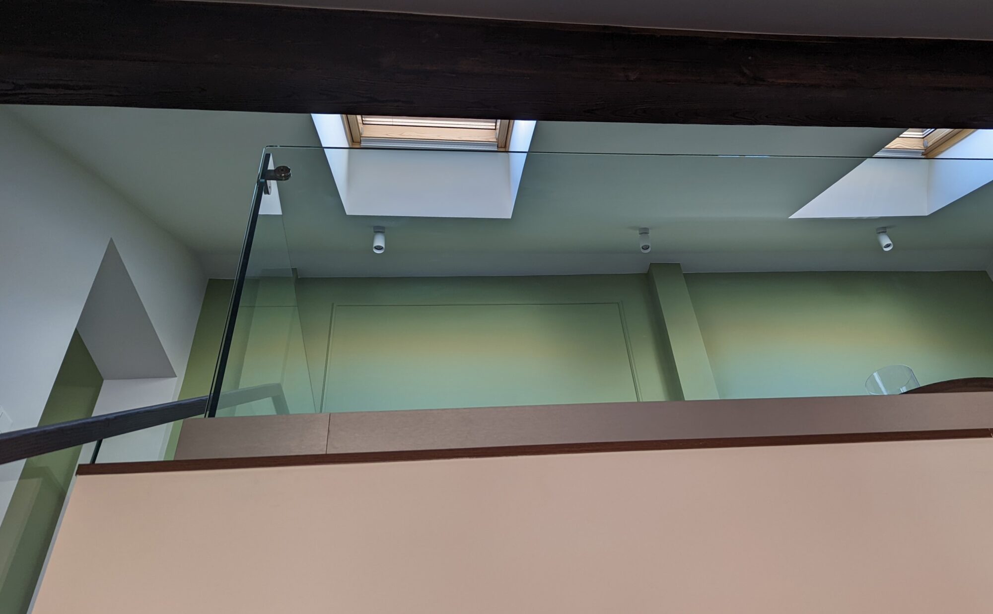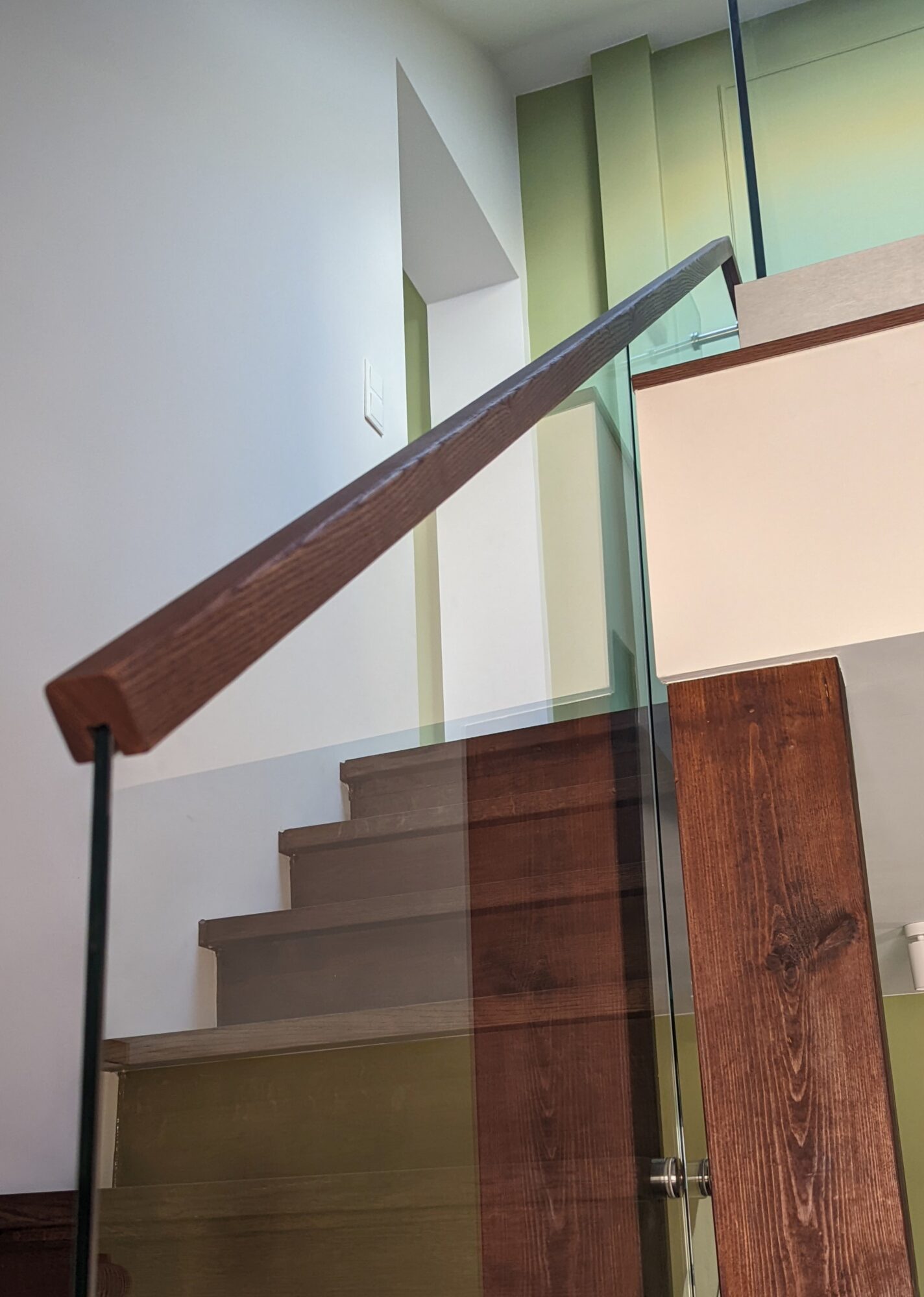 Interior railings with Q-railing glass holding profile. On the second floor, it was not possible to fix the glass railing to the side of the lintel, so we offered the client a Q-railing glass fixing system from the top. We additionally installed a solid ash wood handrail on top of the stairway glass.