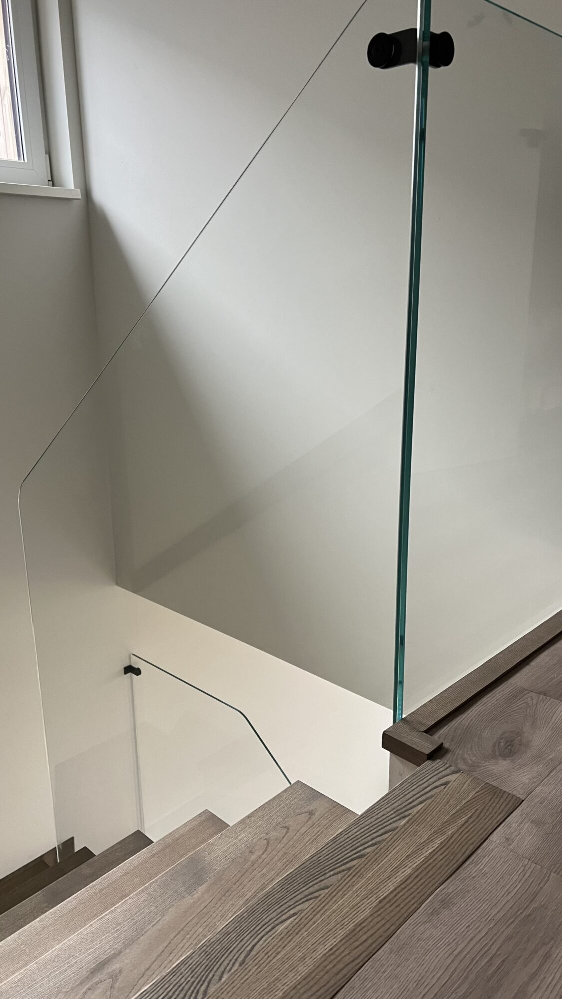 Frameless glass balustrade with painted fixings. We painted the fixing points matt black. We used 10 mm toughened glass with rounded ends.