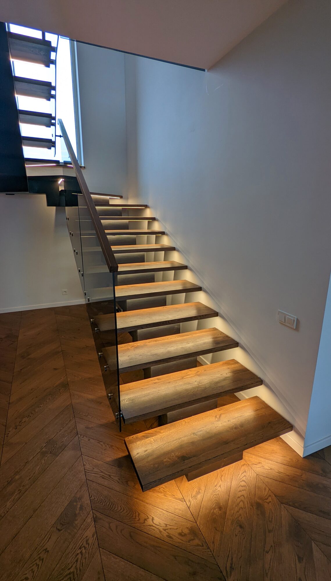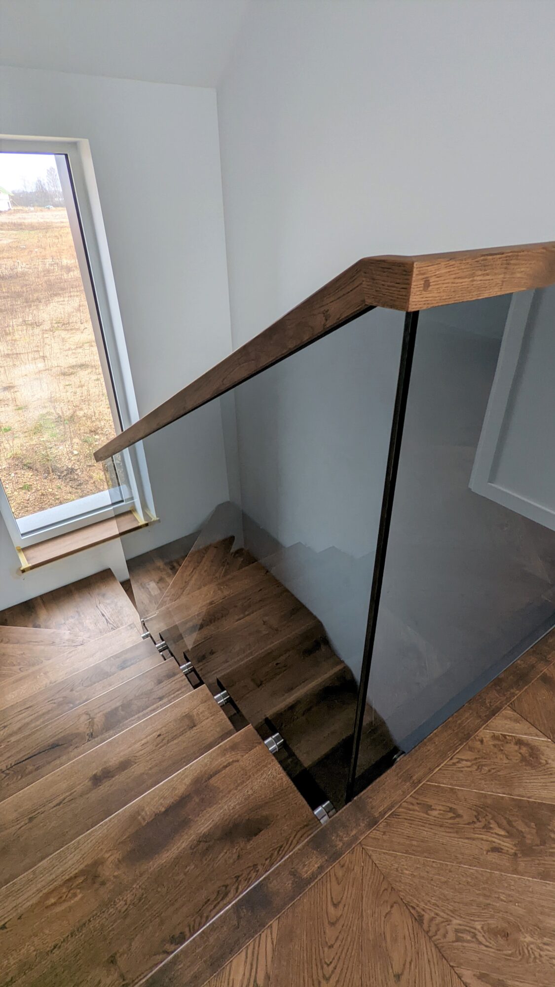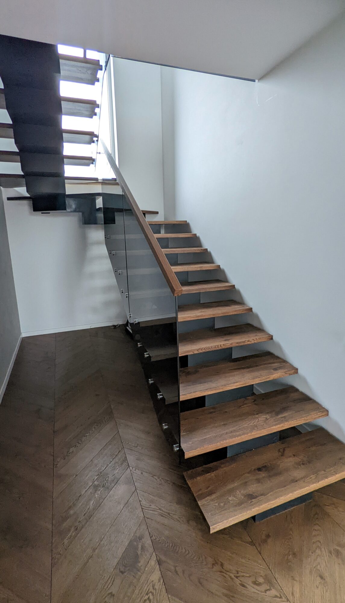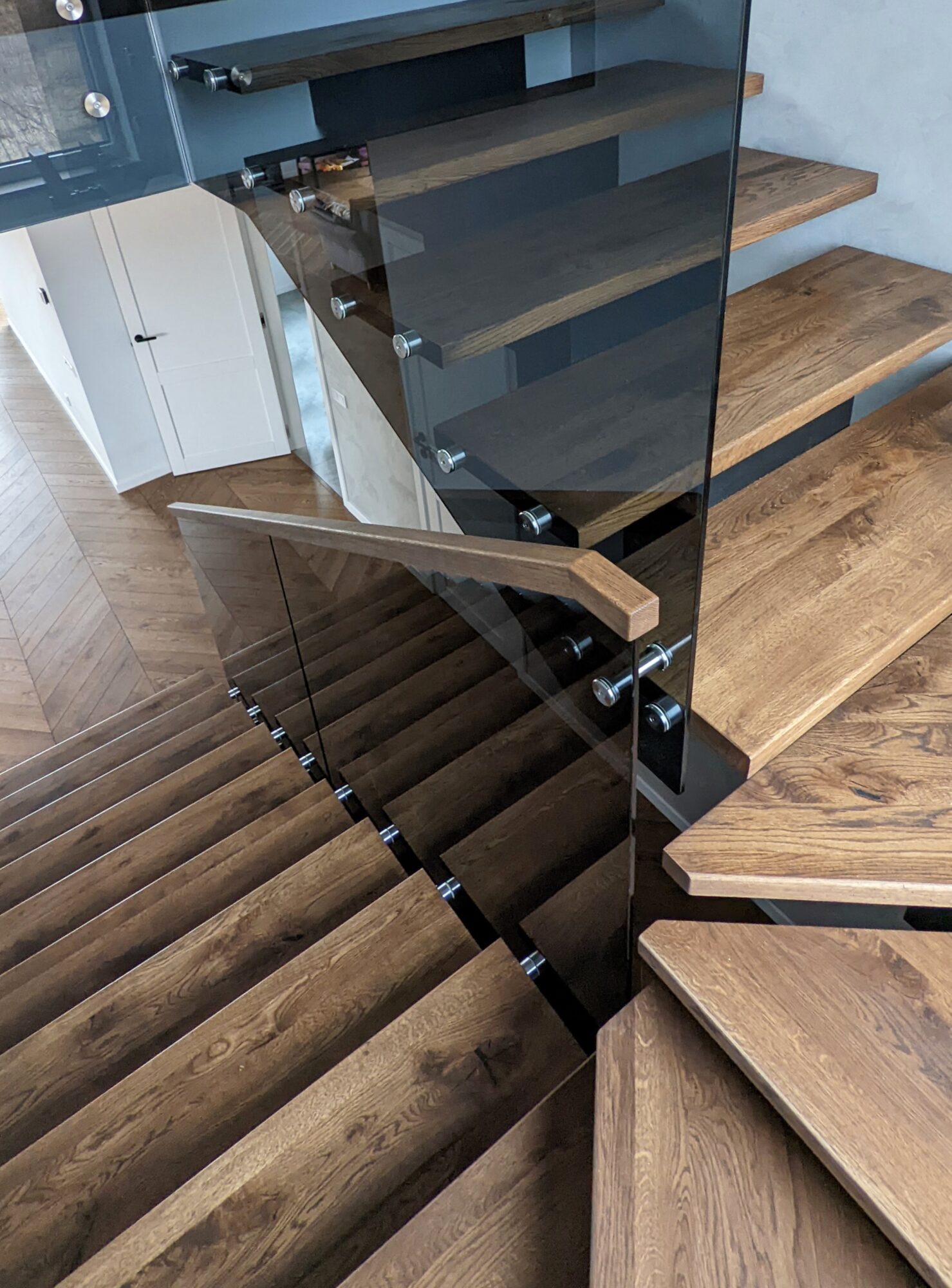 Glass handrails with grey tempered glass. The glass structure was fixed to the wooden steps. The steps have also been reinforced into the wall to reduce the risk of the glass structure breaking through to the other handrail fixings. The handrail is made of solid oak and finished with a stain.