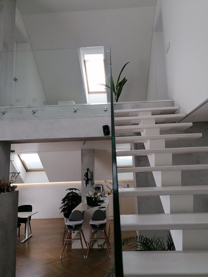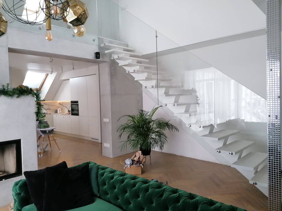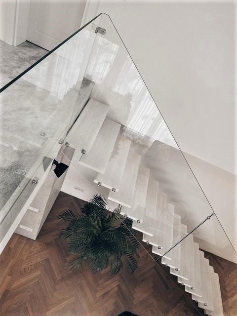 Frameless glass staircase balustrades. Glass 10 mm thick, fixed with stainless steel circular compensators. Height of glass handrail H950 mm.