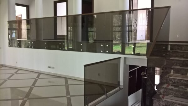 Interior railing with brown glass. Solid oak armrest mounted on glass, armrest stained brown to match the colour of the glass. Lower glass structure mounted on stainless steel glass fittings.