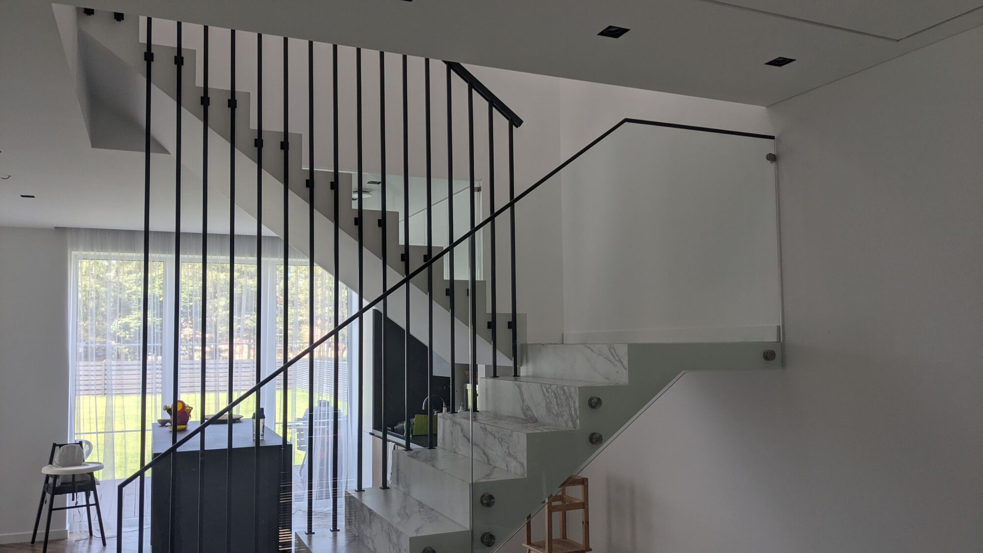Combined glass and metal railings. In this project, we proposed to the client to do a glass wall on the front side, thus not overloading the space with too many metal tubes. The glass in the railing is 10 mm toughened, with a black matt profile applied to the edge of the glass.
