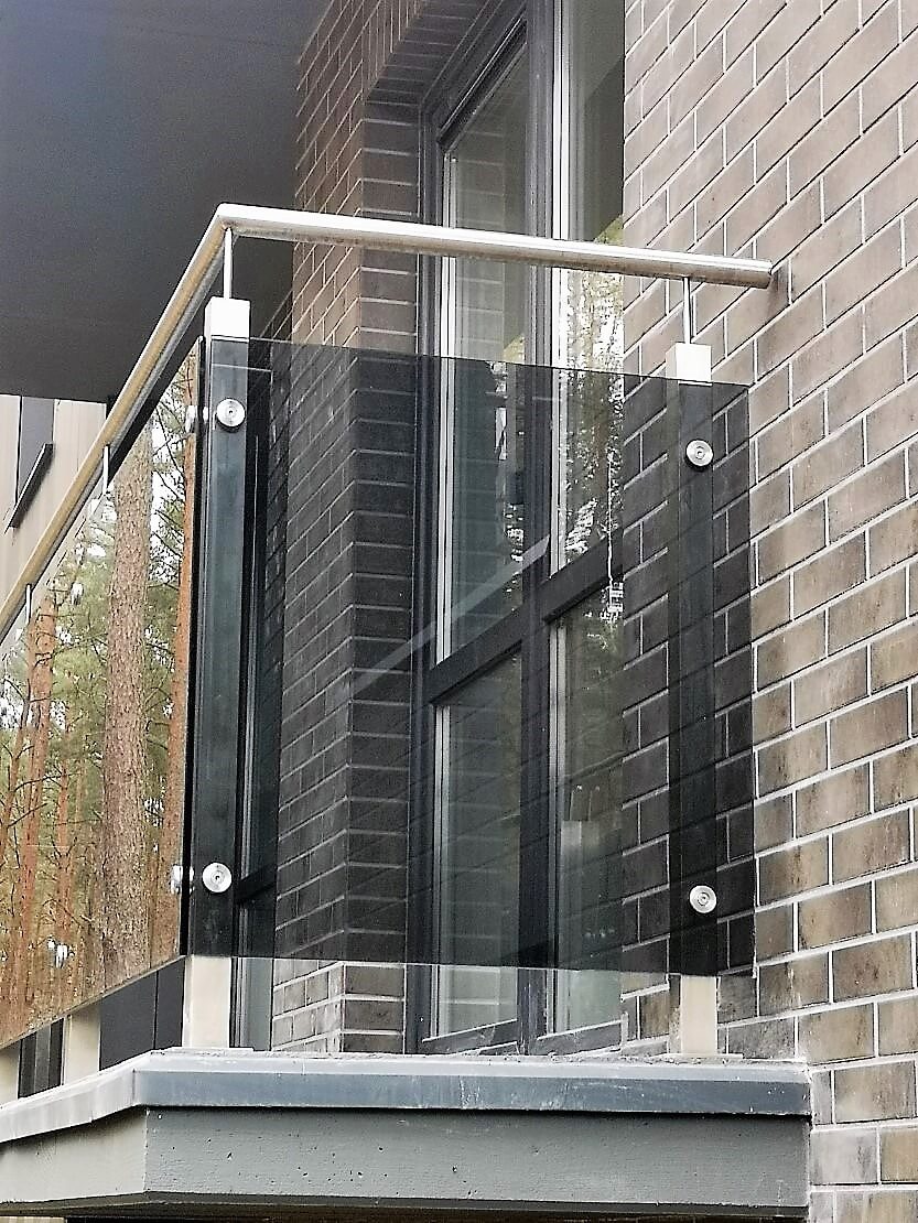 Stiklinis balkono turėklas su nerūdijančio plieno kojomis. Šiame projekte panaudojome 8 mm pilką grūdintą stiklą. Turėklų detalės iš nerūdijančio plieno.