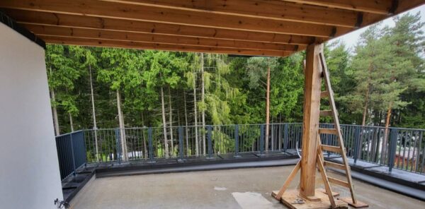 Lauko turėklai iš metalo. Klientas mūsų įmonę pasamdė šiek tiek per vėlai, todėl teko įšpjauti putplastį, norint sumontuoti įdėtines detales turėklų montavimui. Rekomenduojame į mus kreiptis iki namo apšiltinimo pradžios, tuomet darbų eiliškumą galima suplanuoti sklandžiai.