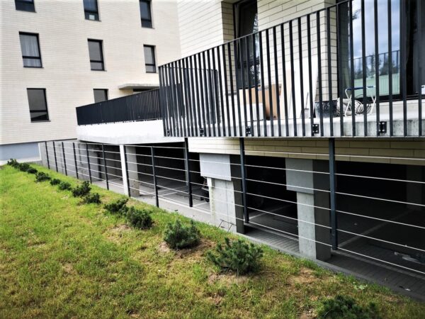 Balkono terasos turėklai. Galime pasiūlyti ir terasos turėklus su pertvaromis. Šiame objekte pertvaros pagamintos iš stiklo. Galime pasiūlyti pertvaras iš kompozito arba metalinio tinklo dažyto milteliniu būdu.