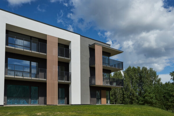 Daugiabučiu balkono turėklas su fasado elementais. Projekte panaudojome stačiakampius profilius 50×20 mm ir 50×10 mm. Papildomai pagaminome fasado elementą iš plastiko ir medžio mišinio – kompozito.