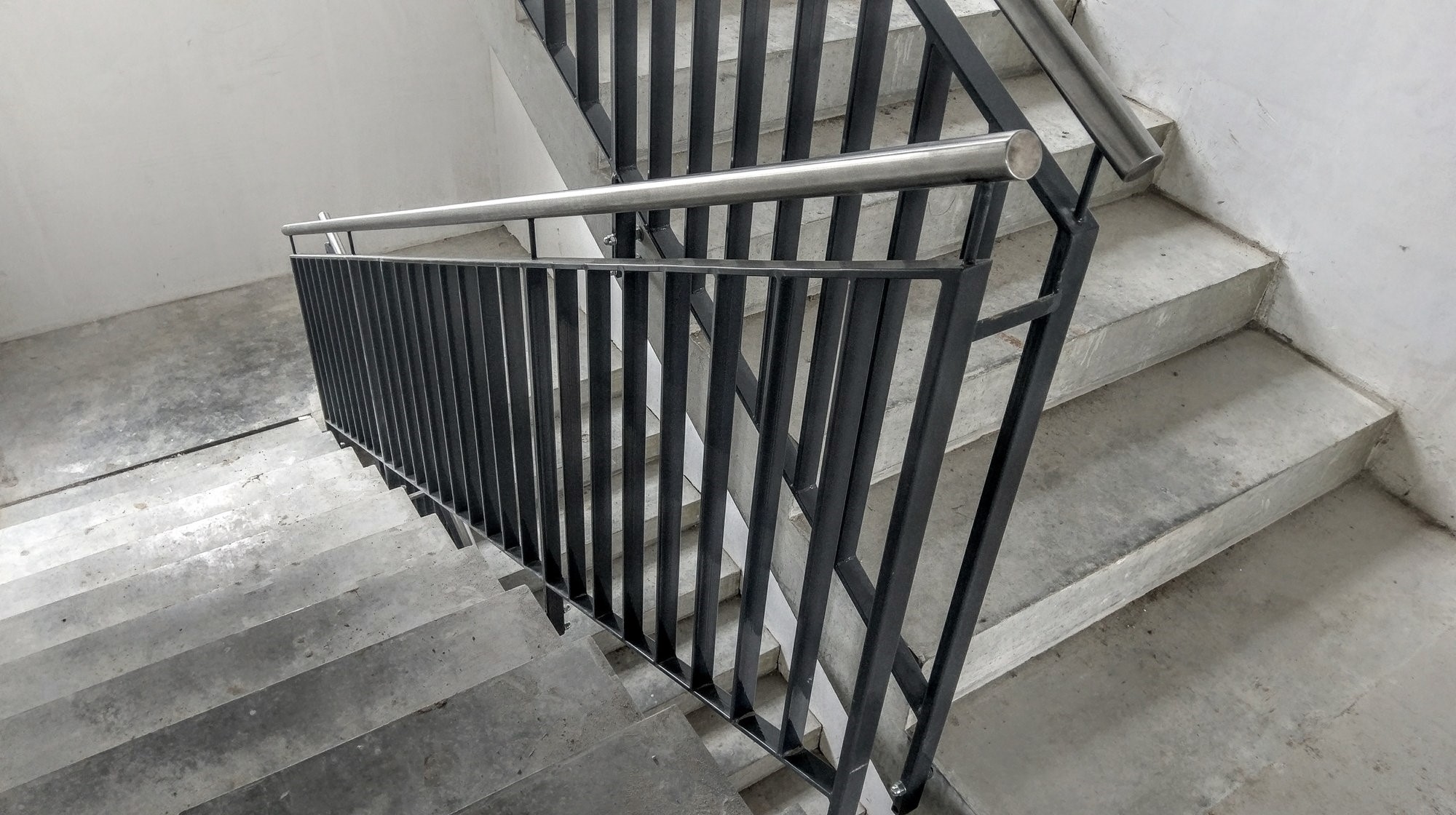Laiptinės turėklas su nerūdijančio plieno porankiu. Norint išsaugoti laiptų plota ir esant reikalingo dydžio tarpui tarp laiptų maršų visuomet rekomenduojame laiptų turėklą tvirtinti iš šono. Šoninis tvirtinimas leidžia lengviau valyti laiptines, nes nereikia apeiti kiekvieno tvirtinimo taško aplinkui.