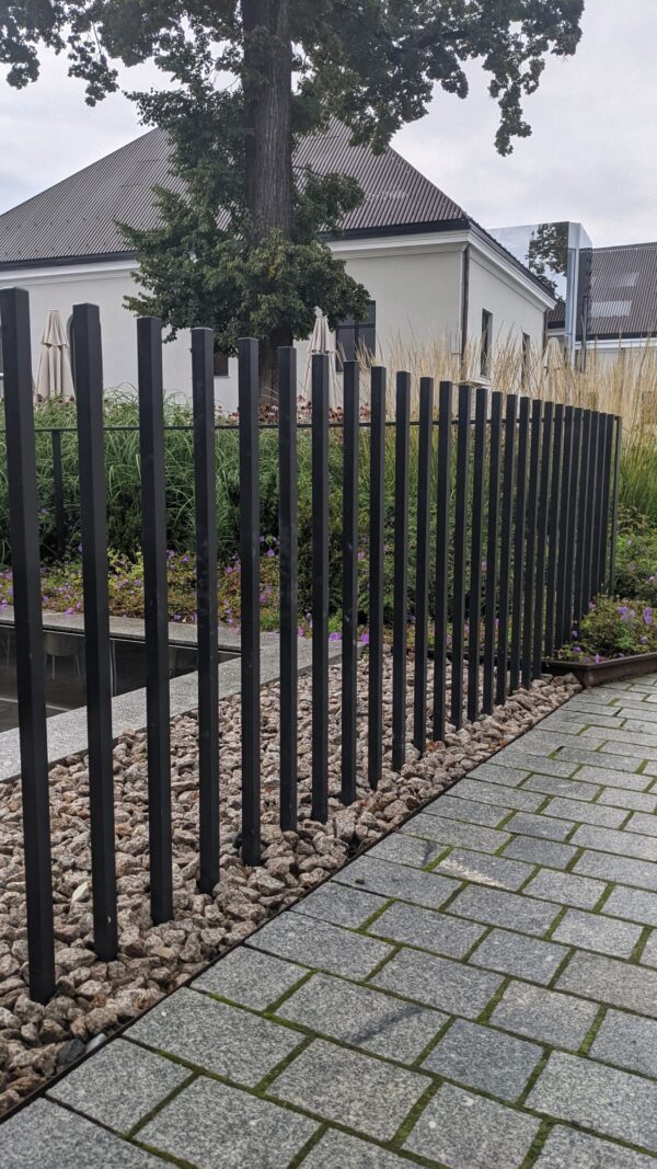 Lauko turėklai iš kvadratinio strypo. Tvirtinimai paslėpti, išorėje matosi tik atskiri metalo strypai. Konstrukcija milteliniu būdu gruntuota ir padengta juoda matine RAL9005 spalva.