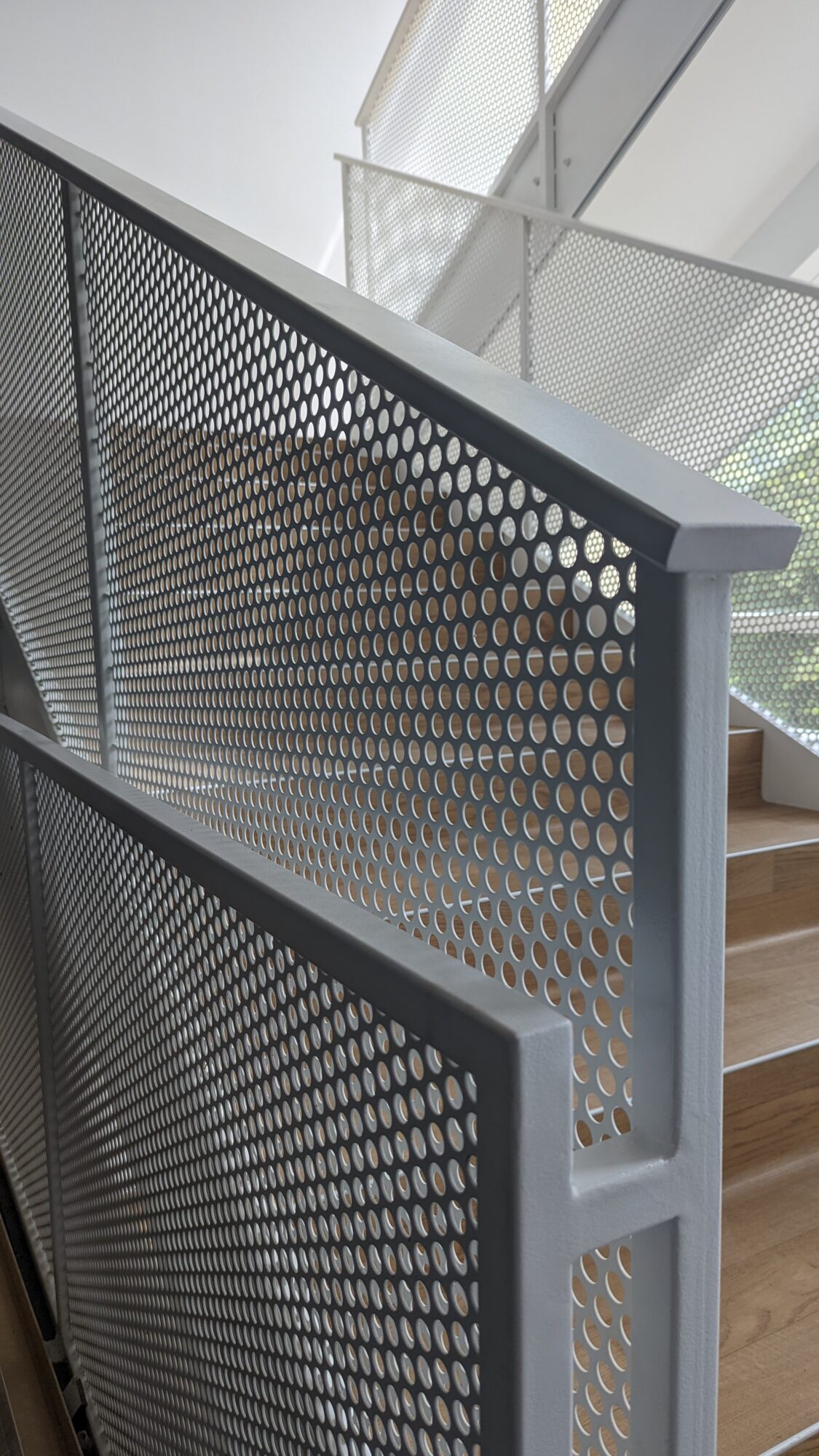 Daugiabučių laiptinės turėklas iš kirstai tempto tinklo. Šio kirstai tempto tinklo akys yra apvalios, tinkas privirintas prie metalo juostos. Tvirtinimas prie laiptų šono per metalo juostą. Konstrukcija yra ypač stabili ir ilgaamžė.