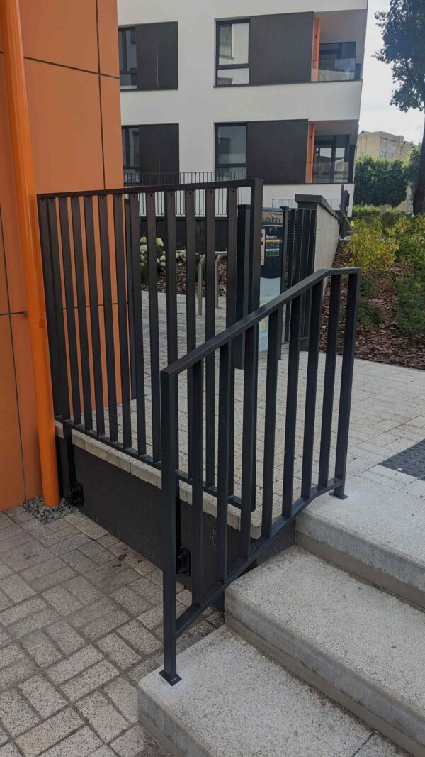 Lauko turėklai prie daugiabučių. Laiptų turėklų konstrukcijos padengtos karštu cinku, po to nušlifuotos ir nudažytos milteliniu būdu RAL7016 matine spalva.