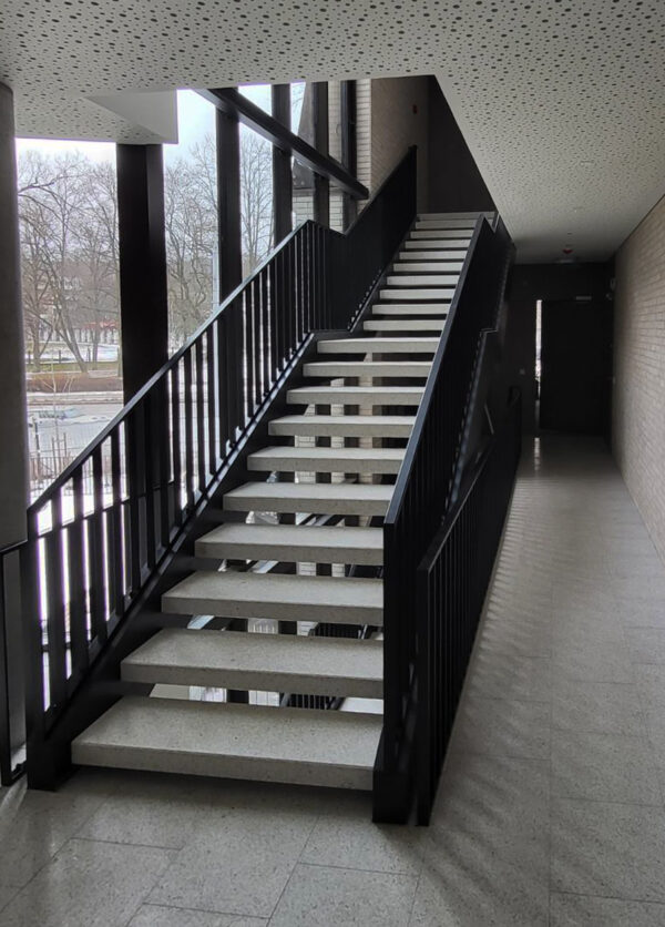 Daugiabučių turėklai iš stačiakampių profilių. Turėklas pritvirtintas prie metalinės laiptasijos, užtikrinant tvirtumą ir ilgaamžiškumą. Šiame projekte naudoti populiarūs 40×20 mm ir 40×10 mm profiliai, suteikiantys konstrukcijai elegantišką ir modernų vaizdą. Paviršius padengtas milteliniu būdu RAL9004 spalva, užtikrinančia atsparumą aplinkos poveikiui ir ilgaamžį estetinį vaizdą.