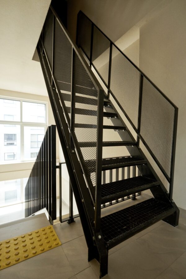 Metalinė vidaus laiptasija su turėklais iš tinklo. Konstrukcija pagaminti iš UPN metalinio profilio ir ažūrinės laiptų pakopos. Dėl saugumo pasiūlėme gaminti turėklus su kirsto tinklo užpildymu.