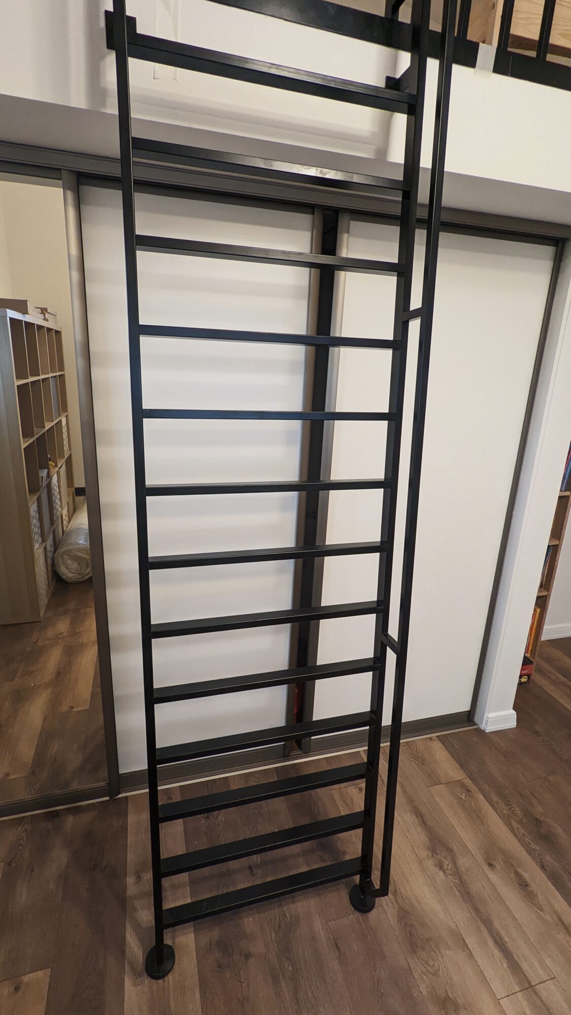 Metalinė laiptasija į antresolę. Laiptų pakopos pagamintos iš uosio masyvo ir nudažtos juoda matine spalva.