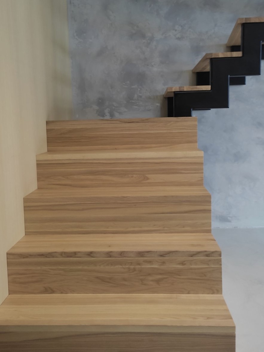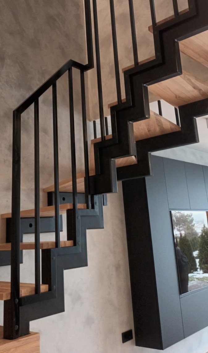 Metalinis laiptų karkasas, dar vadinamas „krokodilas”. Tai yra vienas dažniausiai pasitaikantis laiptų modelis. Šiame projekte papildomai pirmą marša apdirbome medžiu iš visų pusių.