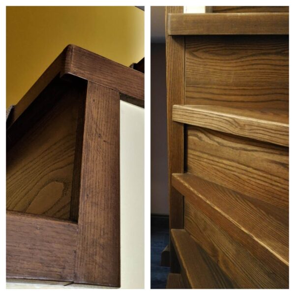 Medinės laiptų pakopos su apvadais. Pakopos su papakopėmis ir šonuose papildomai sumontuoti apvadai. Apvadai padeda apsaugoti sienas valymo metu. Visuomet pakopų spalvą deriname prie užsakovo pateiktų grindų ar kitų vidaus interjero spalvų.