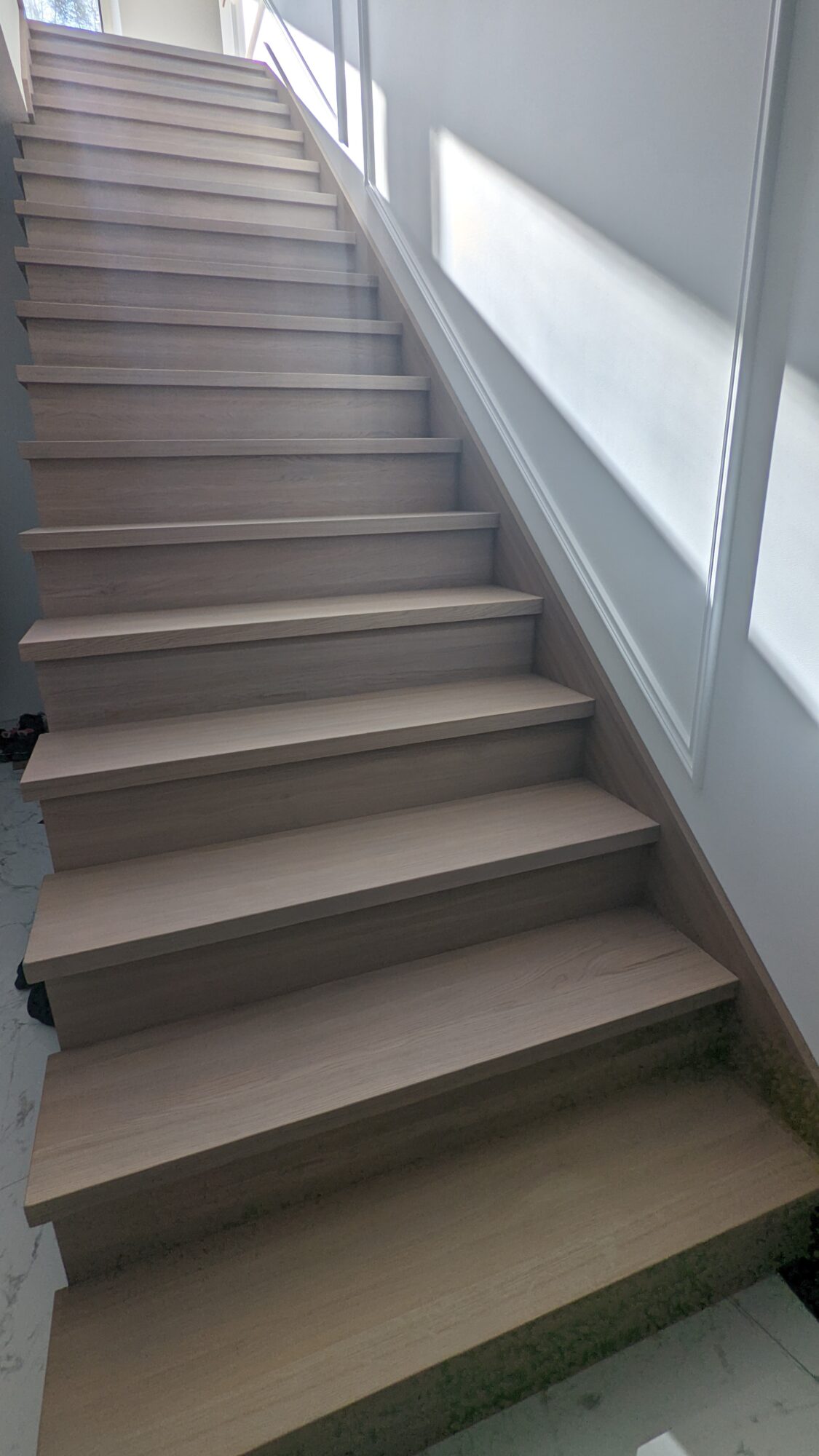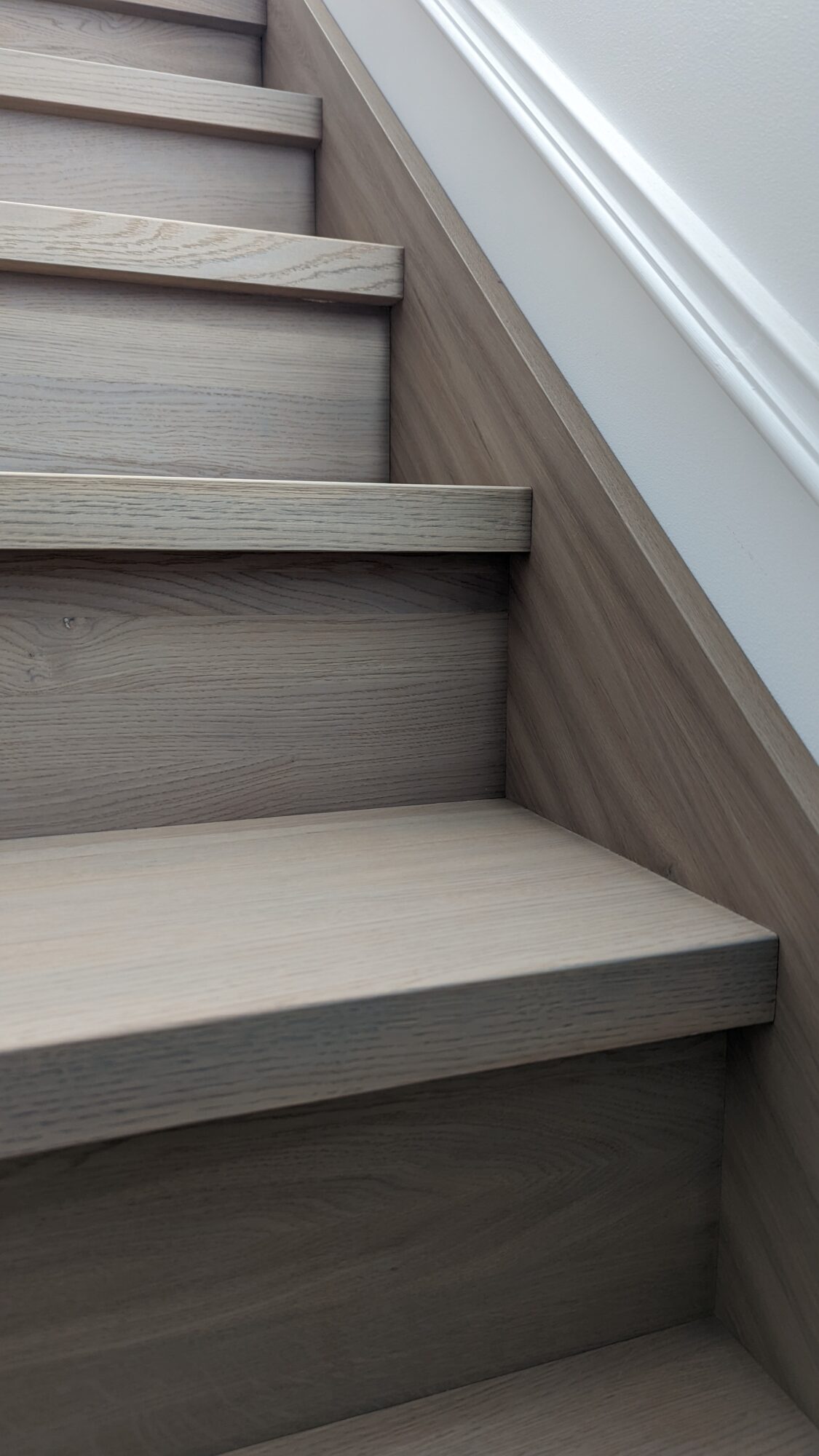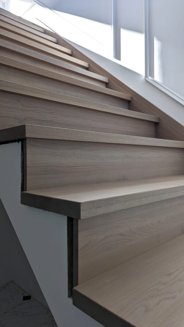 A klasės Ąžuolo masyvo pakopos su plačiu apvadu. Kliento namie vyrauja klasikinis interjeras, mūsų įmonės specialistai pasiūlė prie sienos sumontuoti platesnį ir aukštesnį apvadą, suteikiant laiptams išskirtinumo.